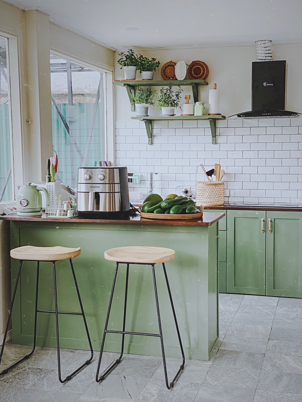 Việt Anh chia sẻ bí quyết chỉ nên chọn 2-3 tông màu chủ đạo xuyên suốt để nới rộng không gian và không bị rối mắt. Căn bếp nổi bật với sự kết hợp của xanh bơ, gỗ nâu và trắng. Các vật dụng, nội thất cũng được chọn lựa, sắp xếp sao cho có màu sắc tương đồng. |