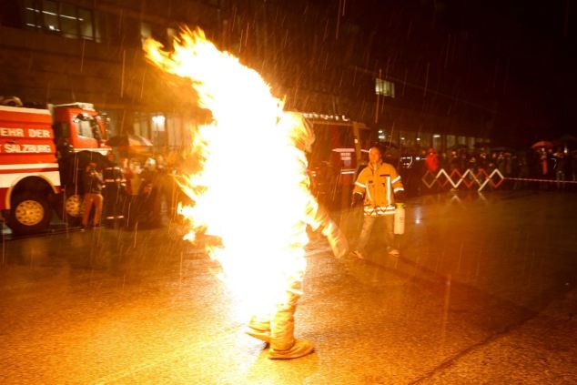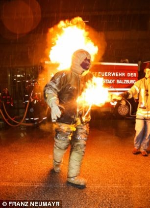Để xác lập kỷ lục thế giới mới, anh đã đi vòng quanh các đường phố ở Aalzburg trong vòng 5 phút, 41 giây với ngọn lửa rực cháy quanh cơ thể. Ảnh: Franz Neumayr. |