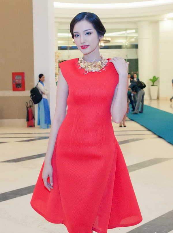 | Hoa hậu Trúc Diễm nổi bật với váy tông màu đỏ, vòng cổ cá tính nổi bật. |