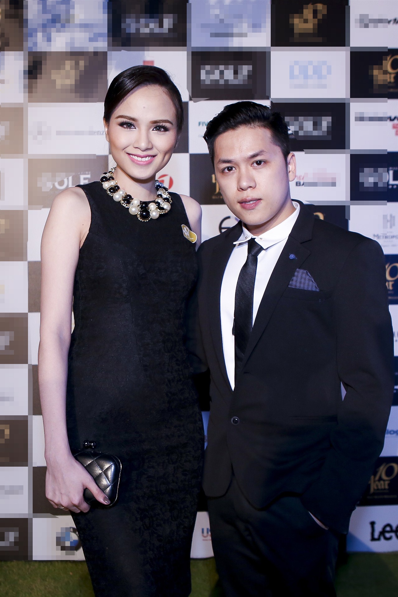 | Trong khi đó, Diễm Hương diện trang phục váy tối màu trang trọng, tiệp tông cùng bộ cánh vest đen của hôn phu Quang Huy. |