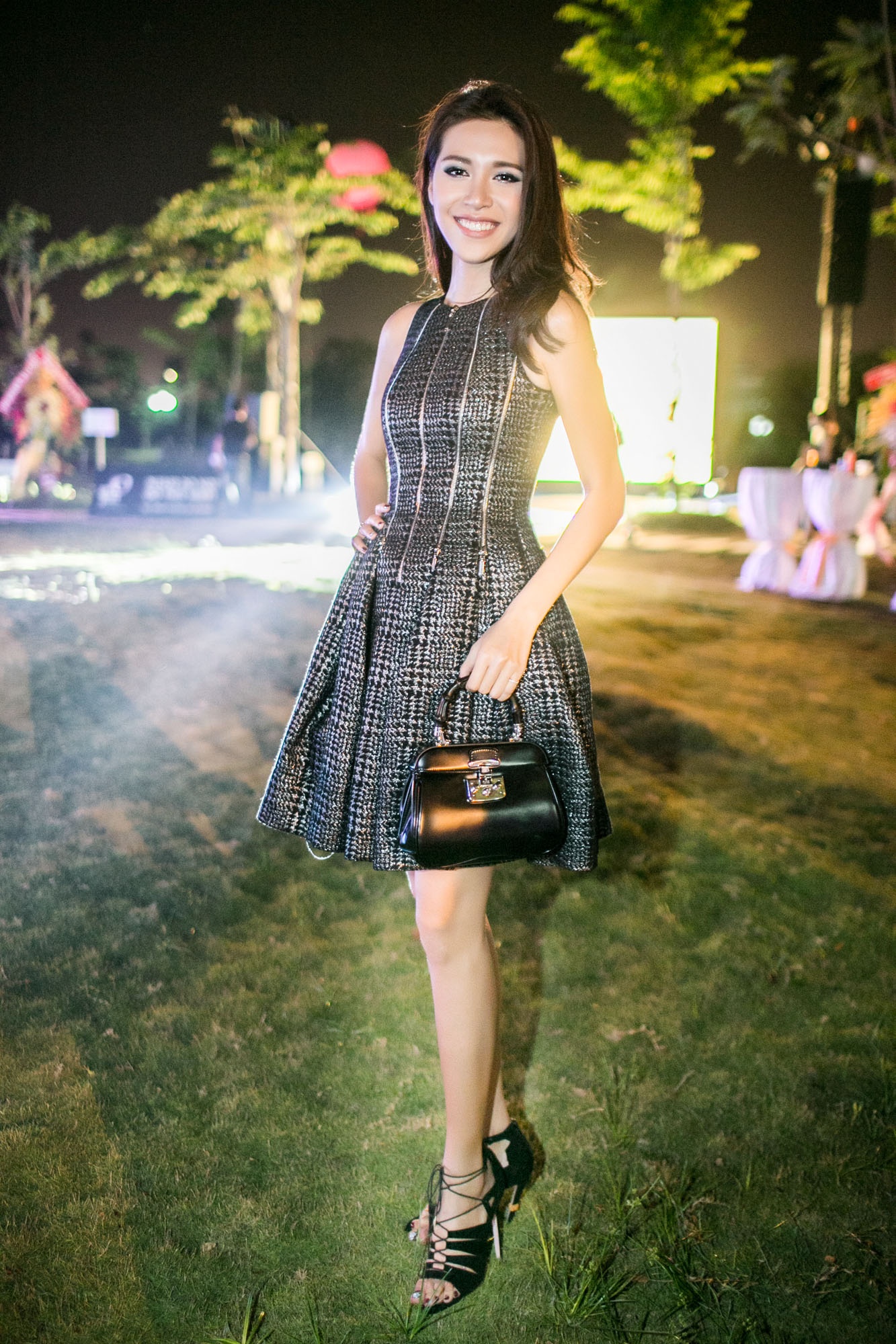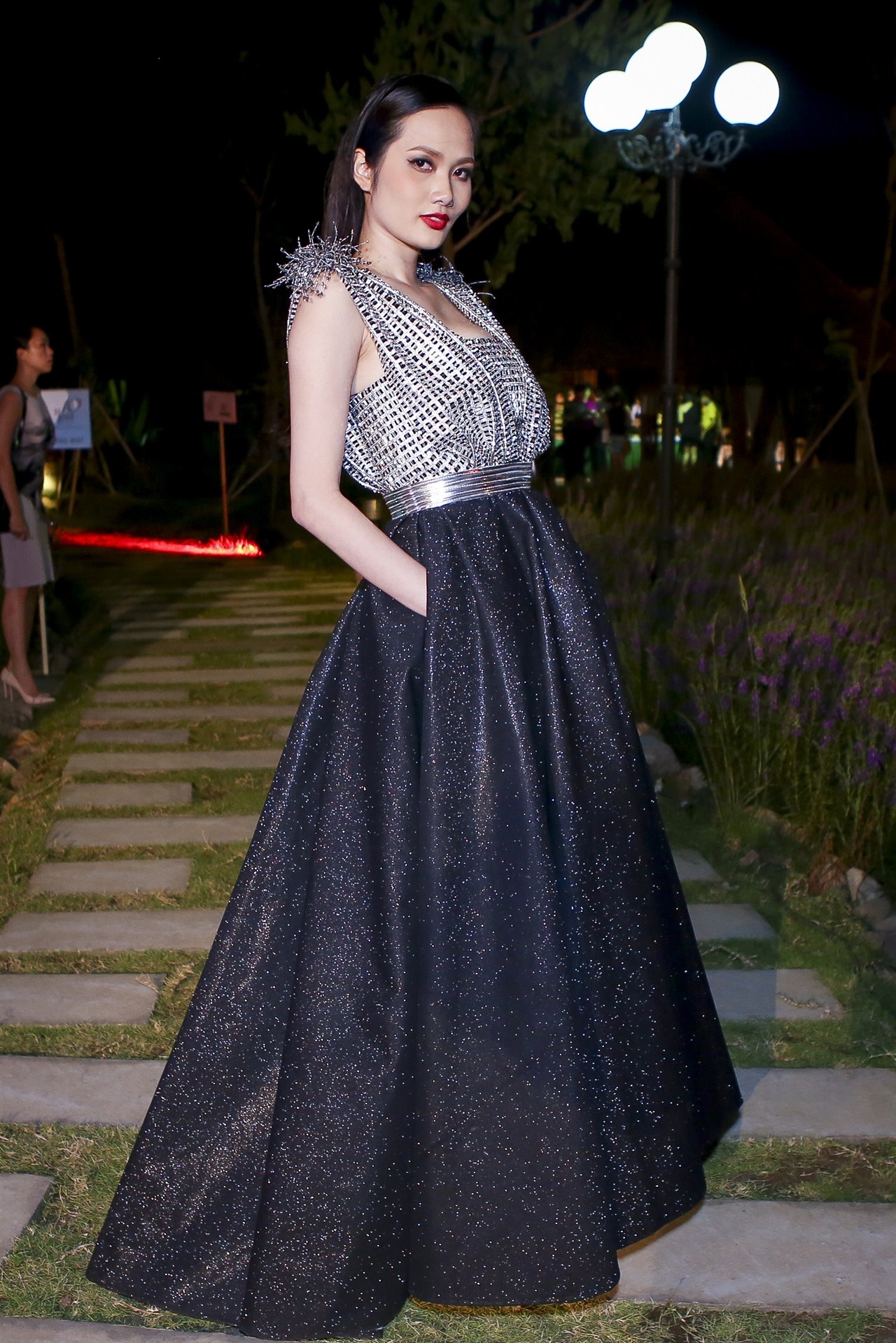 | Chân dài Diệu Linh hấp dẫn ánh nhìn với bộ váy bồng xòe nữ tính, sang trọng. |