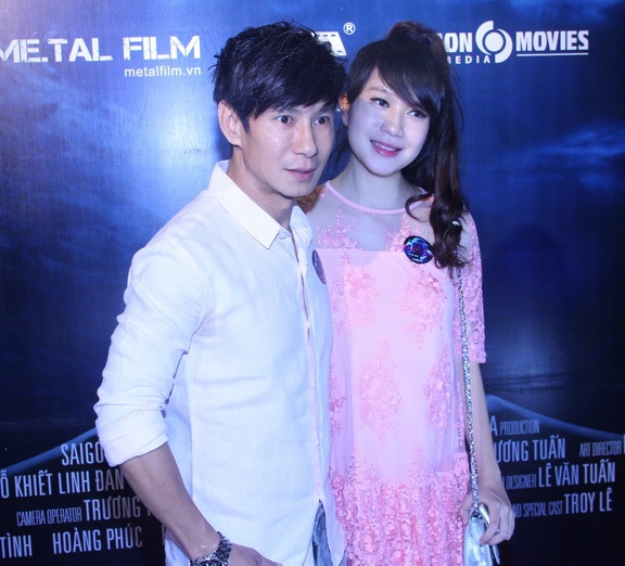 | Phùng Ngọc Yến đi xem phim cùng ông xã. Vợ chồng cô chụp hình cùng đạo diễn Thành An của bộ phim. |