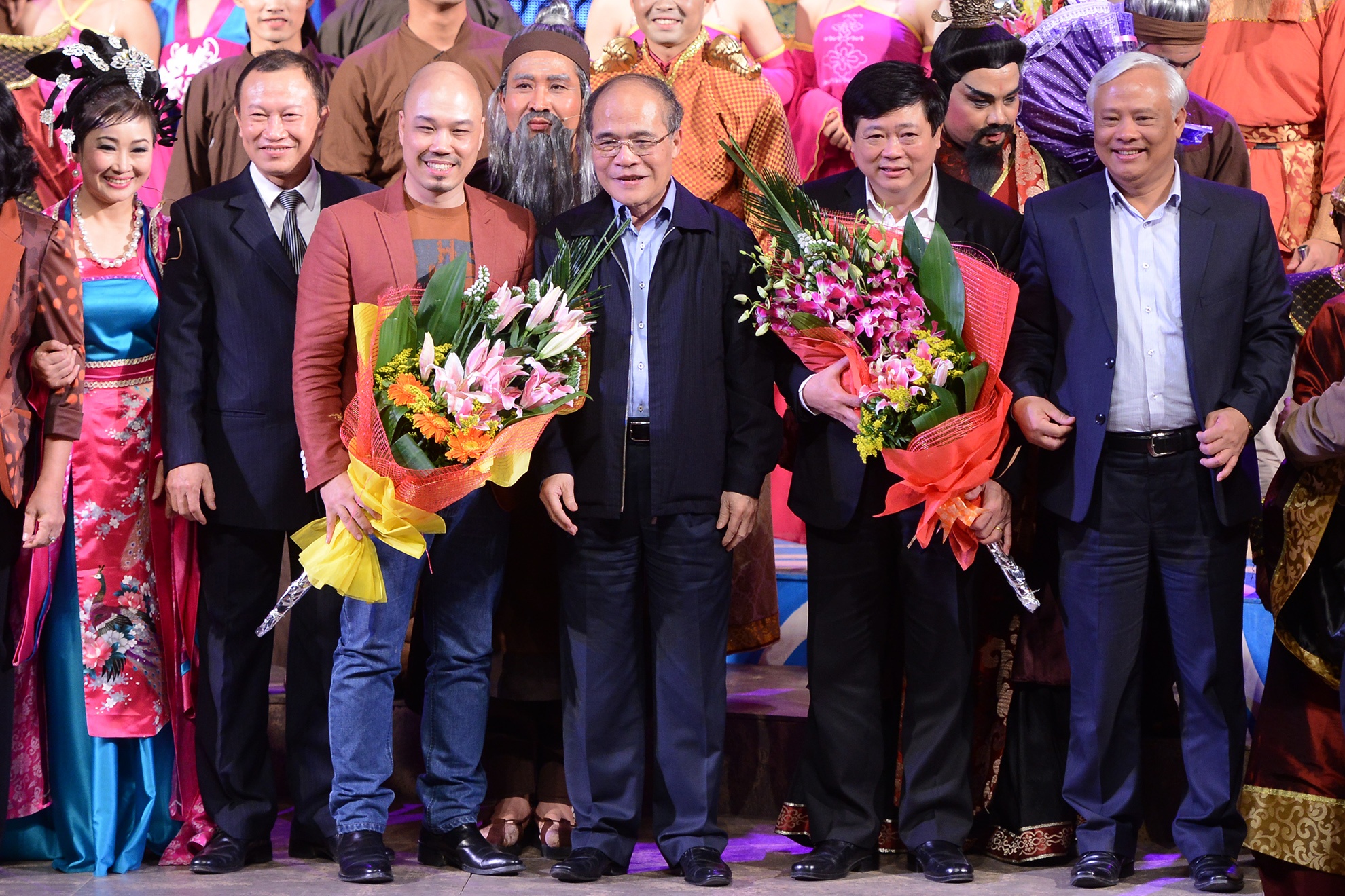 Chủ tịch Quốc hội Nguyễn Sinh Hùng chia vui cùng tác giả Nguyễn Thế Kỷ và đạo diễn Triệu Trung Kiên. Sự thành công của vở diễn góp phần đưa khán giả trở lại gần hơn với các thể loại diễn xướng truyền thống như cải lương.