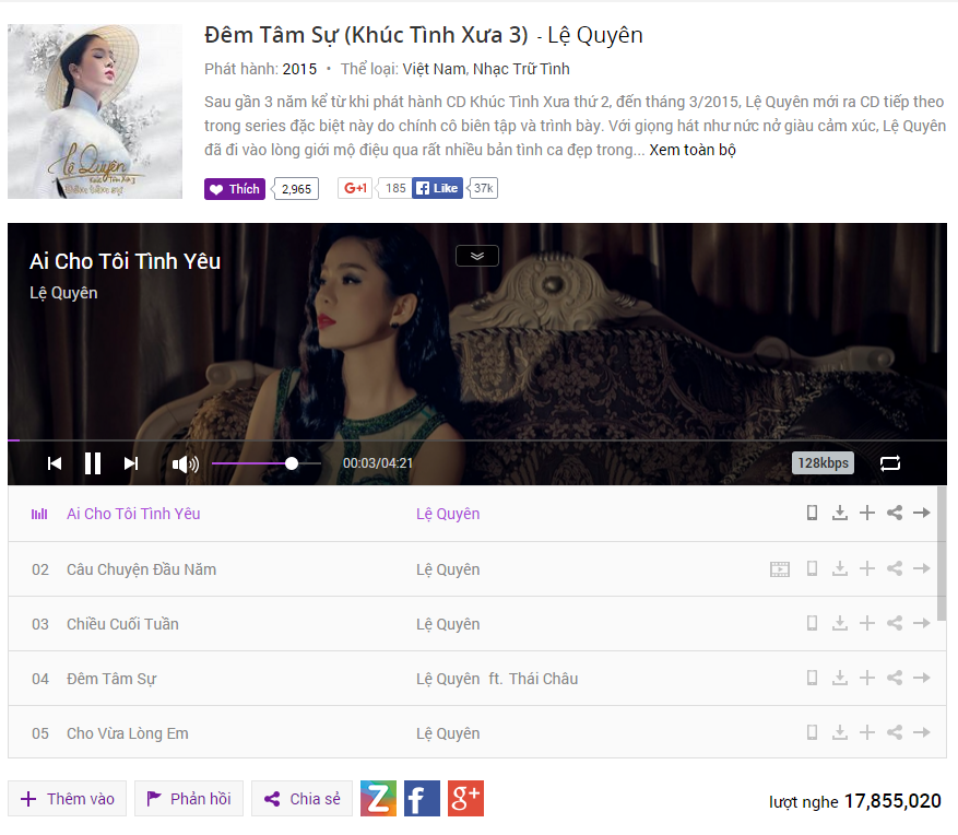 Tại top 10 Album của năm, Đêm tâm sự (Khúc tình xưa 3) của Lệ Quyên và Em là của anh của Hồ Việt Trung, Hồ Quang Hiếu là 2 album có lượt nghe “khủng”, đều trên 17 triệu. Bám sau là album Chỉ còn trong ký ức của Hồ Quang Hiếu và Vợ người ta của Phan Mạnh Quỳnh với hơn 9 triệu lượt nghe.