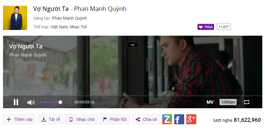Trong danh sách này còn có sự xuất hiện của hai đối thủ đáng gờm là “thánh mưa” Trung Quân với Chưa bao giờ (hơn 74 triệu lượt nghe) và Phan Mạnh Quỳnh với ca khúc Vợ người ta (hơn 81 triệu lượt nghe). Lúc này, tác giả gốc Nghệ An tạm dẫn đầu cuộc đua với lượt nghe cao nhất. Dù hit của Phan Mạnh Quỳnh ra đời vào thời điểm cuối năm, nhìn qua thì anh không có nhiều lợi thế như các đối thủ. Tuy nhiên, Vợ người ta đã lập kỷ lục mà hiếm ca sĩ nào vượt qua.