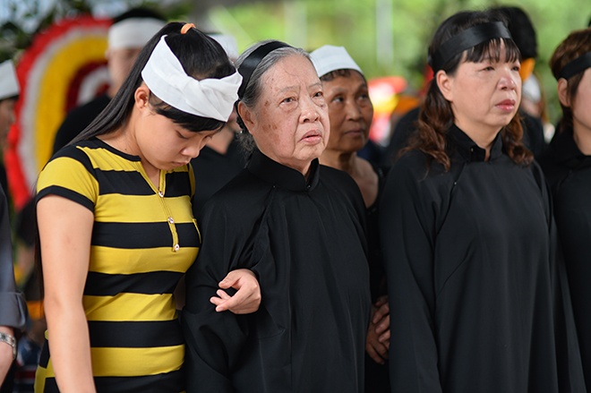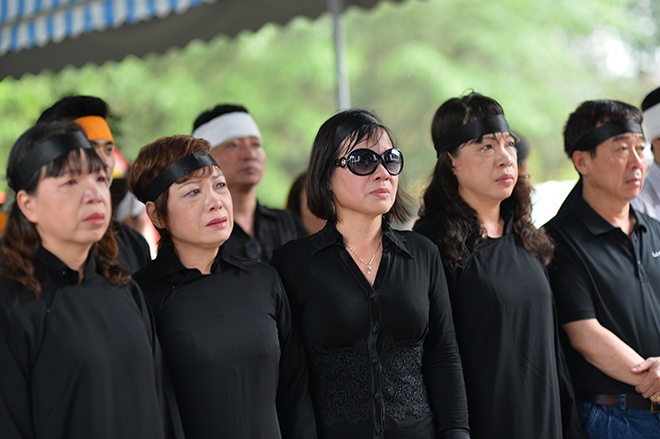 | Các con gái NSND Trịnh Thịnh chít khăn và mặc áo đen, đôi mắt đỏ hoe trong giờ tiễn biệt cha. |