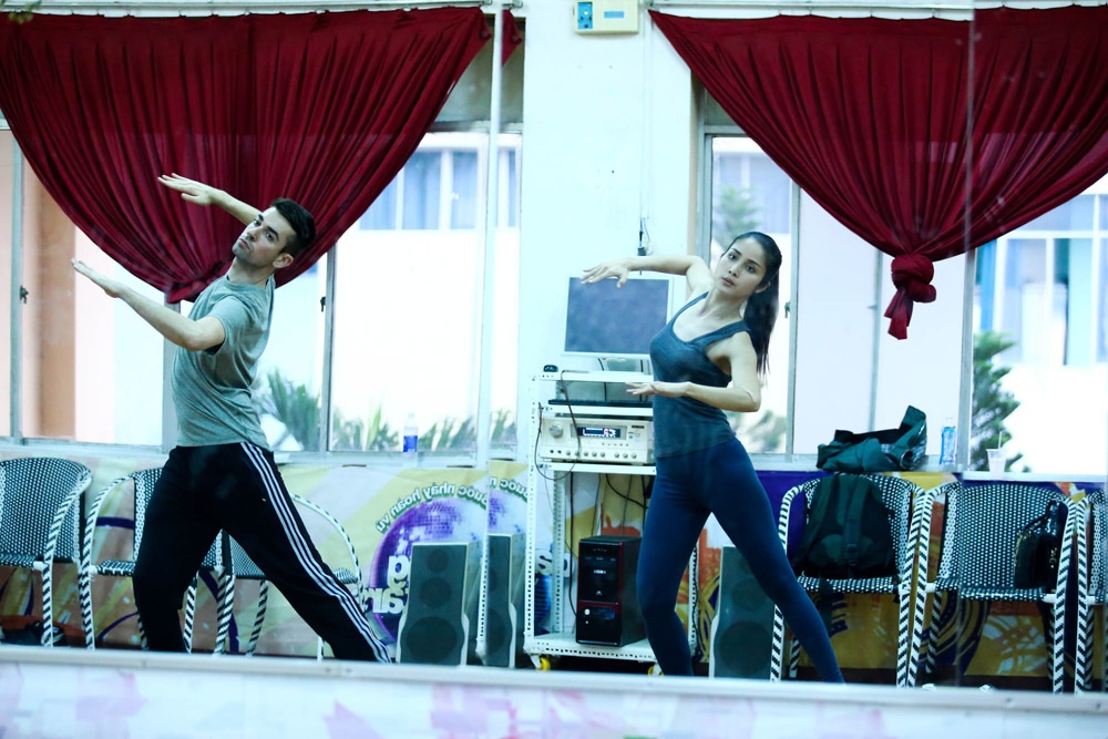 | Biết Thảo Trang căng thẳng, nam vũ công điển trai luôn tạo không khi vui vẻ, thoải mái trong lúc tập luyện. Anh còn bế bà xã của Thanh Bình trước ống kính. |