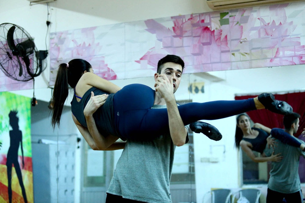| Cô và bạn nhảy xì tin trên sàn tập. |
