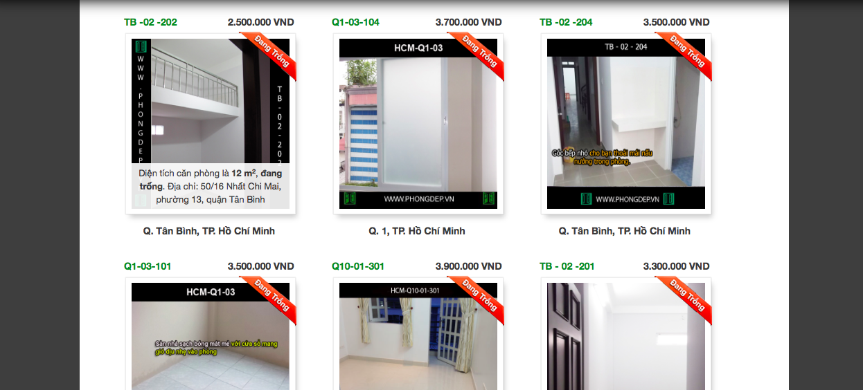 Đầu tiên là hệ thống website www.PhongDep.vn hoạt động như một siêu thị phòng cho thuê. Với ý tưởng giúp cho người thuê có thể nắm toàn bộ thông tin về căn phòng muốn thuê trên web để giảm bớt công sức và thời gian đi xem nhiều lần. Trang web này trưng bày tất cả các loại phòng cho thuê với các hình ảnh chụp đúng hiện trạng và giá cả chi tiết .Đặc biệt, người thuê có thể điều chỉnh giá thuê theo nhu cầu tiện nghi muốn trang bị cũng như thời gian thuê.Vì thế trang web trở thành nơi tham khảo miễn phí và hiệu quả của tất cả những bạn trẻ mỗi khi có nhu cầu tìm phòng thuê cho mình.