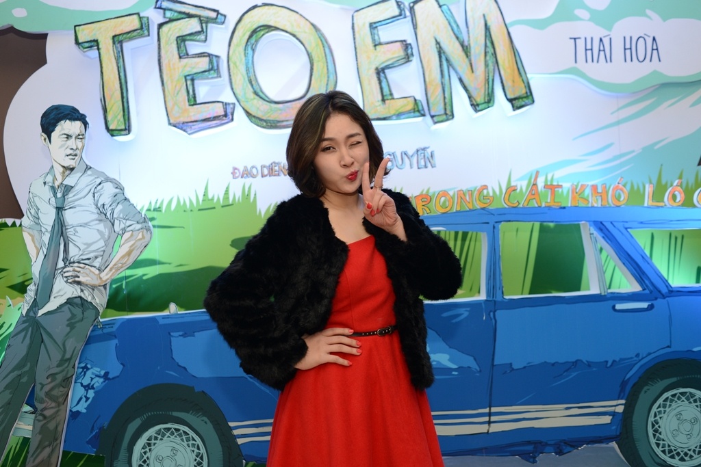 | Đích thân bà xã tháp tùng "Tèo Em" Thái Hòa tới buổi công chiếu. Kể từ khi kết hôn, Thái Hòa thỉnh thoảng mới đưa vợ đi dự tiệc cùng mình.   |