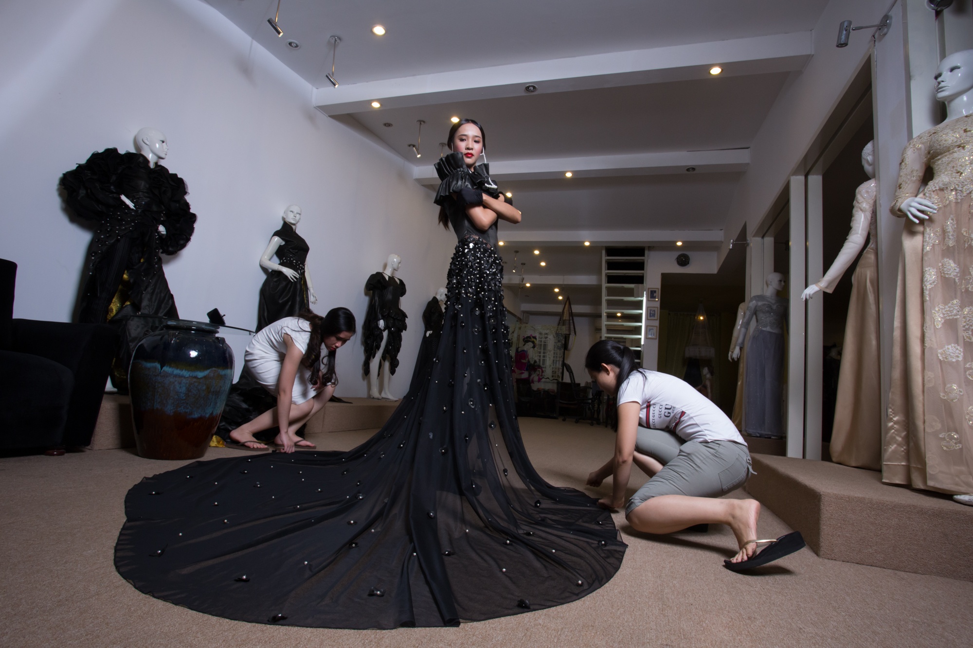NTK Võ Việt Chung miệt mài chỉnh sửa tông trang điểm, quần áo cho người mẫu Phan Phương trong buổi chụp ảnh giới thiệu BST mà anh sẽ giới thiệu trên sàn diễn quốc tế sắp tới.