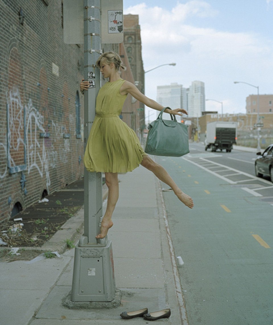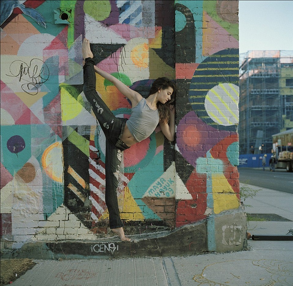 | Cô gái say mê với động tác múa trong trang phục quần jean, áo thun tại bức tường đầy màu sắc ở Williamsburg, Brooklyn. Cuộc sống là sàn diễn muốn nhấn mạnh ở đâu có đam mê, ở đó có người nghệ sĩ, nó hoàn toàn không bị trói buộc, hay quy định bởi trang phục, nơi chốn... |