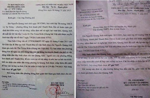 | Hai bức công văn của UBND phường Đông Sơn và Sở GD&ĐT tỉnh Thanh Hóa vận động bình chọn cho Quang Anh đã khiến cư dân mạng xôn xao. |