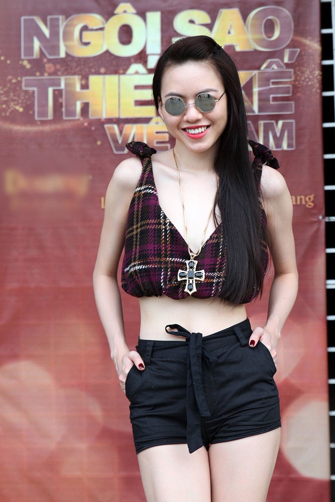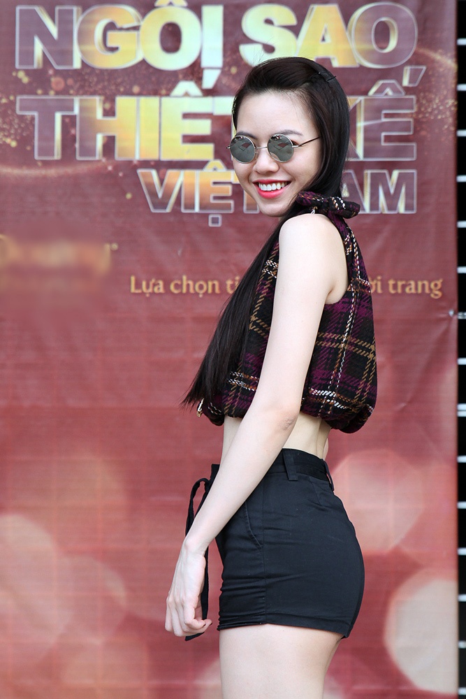 Trong buổi tập luyện cho chương trình "Ngôi sao thiết kế thời trang", nữ người mẫu khoe làn da trắng không tỳ vết và vòng eo thon gọn với áo crop top.