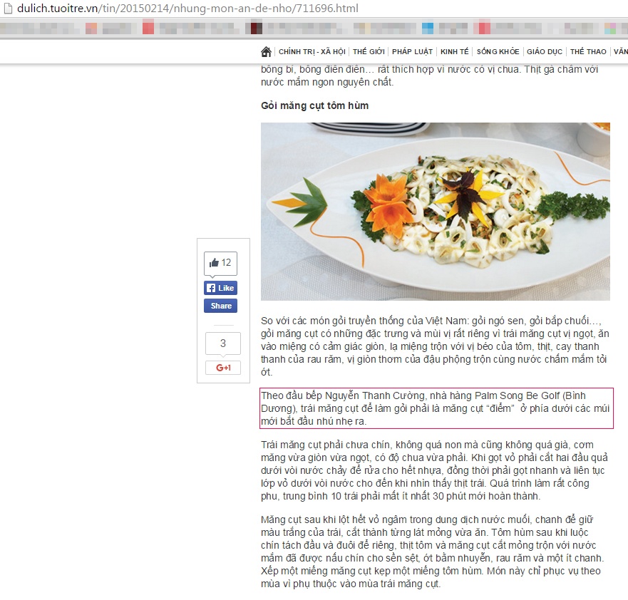 Thông tin này cũng trùng khớp với một bài viết về ẩm thực trong chuyên mục Du lịch của báo Tuổi Trẻ, đăng ngày 22/2. Trong phần Gỏi măng cụt tôm hùm, báo có trích ý kiến của đầu bếp Nguyễn Thanh Cường, nhà hàng Palm Song Be Golf (Bình Dương).