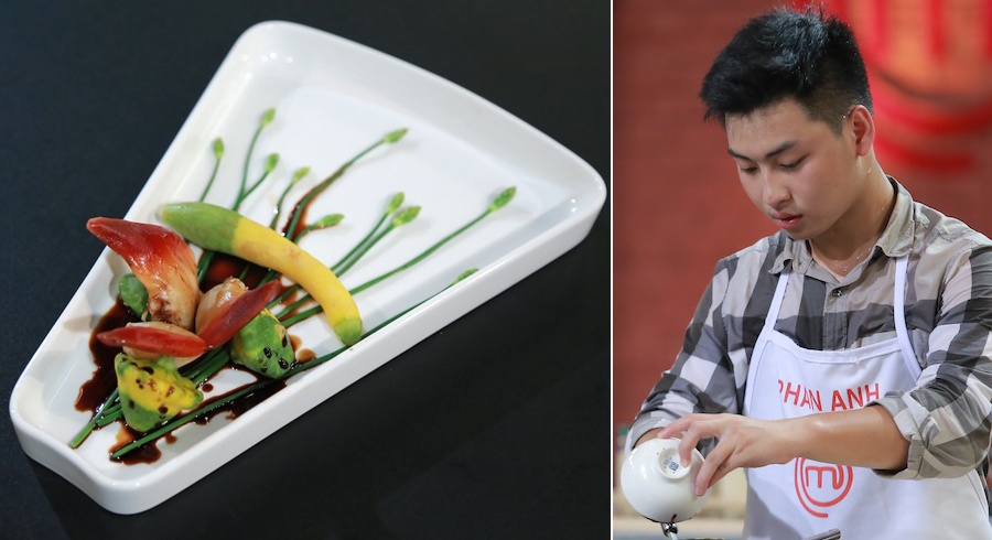 | Phan Anh thực hiện món Sò đỏ nướng sốt teriyaki của Nhật. Dù phần sò bị nhận xét là dai nhưng nước sốt xuất sắc cùng phần trình bày đẹp mắt đã giúp chàng trai Hà Nội bước tiếp vào top 6. |