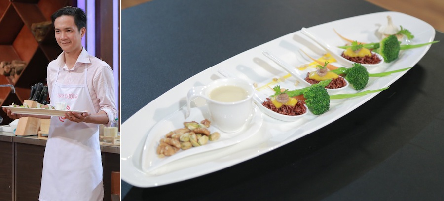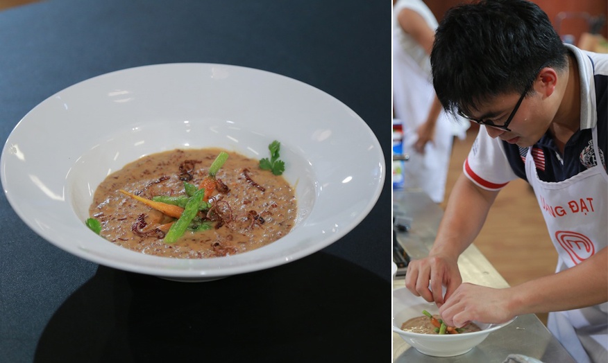 | Dù một nửa thời gian trôi qua mà vẫn chưa biết món ăn của mình là gì nhưng Quang Đạt xuất sắc lọt top 3 người có món ăn ngon nhất. Món Cháo gạo lứt của anh được nhận xét là có vị thanh mát, có sự cân bằng giữa các nguyên liệu và tinh tế không kém risotto nổi tiếng của Italy. |