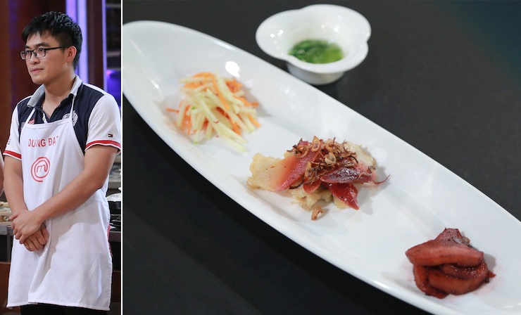 | Cũng chọn làm sò nhưng Sò đỏ nướng mỡ hành của Quang Đạt lại không được đánh giá cao. Giám khảo Tuấn Hải cho biết, cách nướng đã làm mất hẳn vị của sò. Không những thế, táo nấu rượu ăn kèm không phù hợp với món chính đã khiến chàng nghiên cứu sinh điển trai mất điểm. |