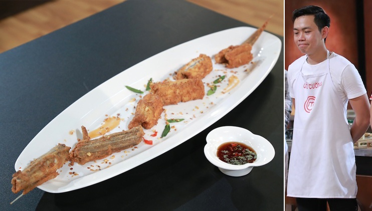 | Đây cũng là một phần thi xuống dốc của Quốc Cường khi món Cá chìa vôi chiên giòn sốt me của anh bị chê là trang trí sơ sài, buồn cười. Tuy nhiên, cá chín tới và nước sốt me ngon miệng đã giúp Quốc Cường vớt vát phần nào trước giám khảo. |