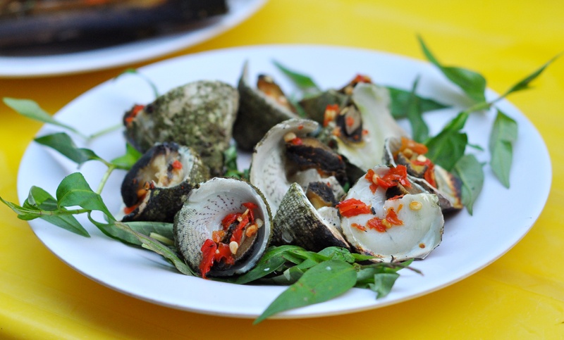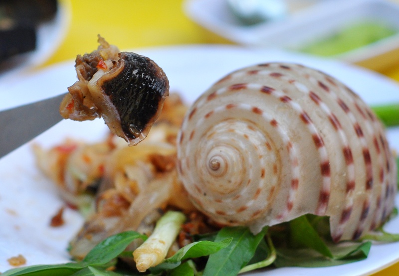 | Ốc giác nướng muối ớt, con ốc rất to, phải thái sẵn thành nhiều lát có giá 20.000 - 25.000 đồng/con. |