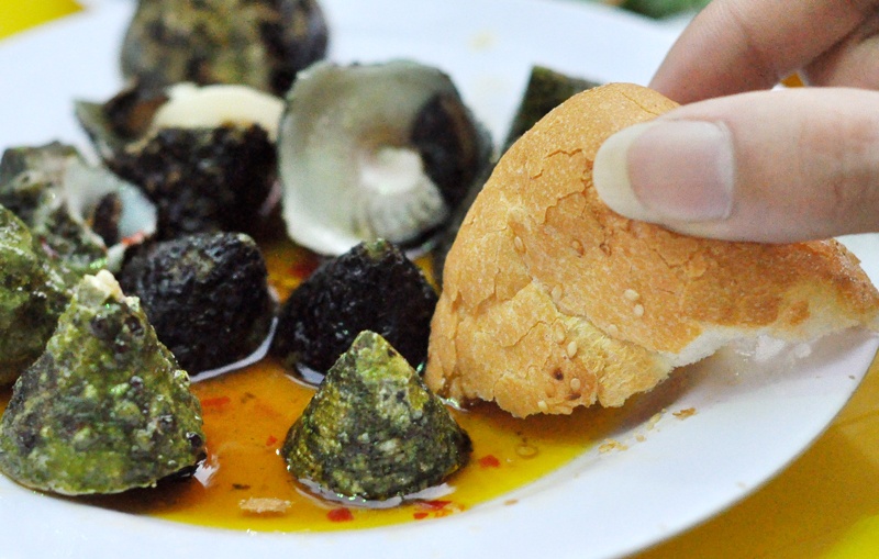 | Ốc "vú chàng" xào bơ chấm bánh mì. |