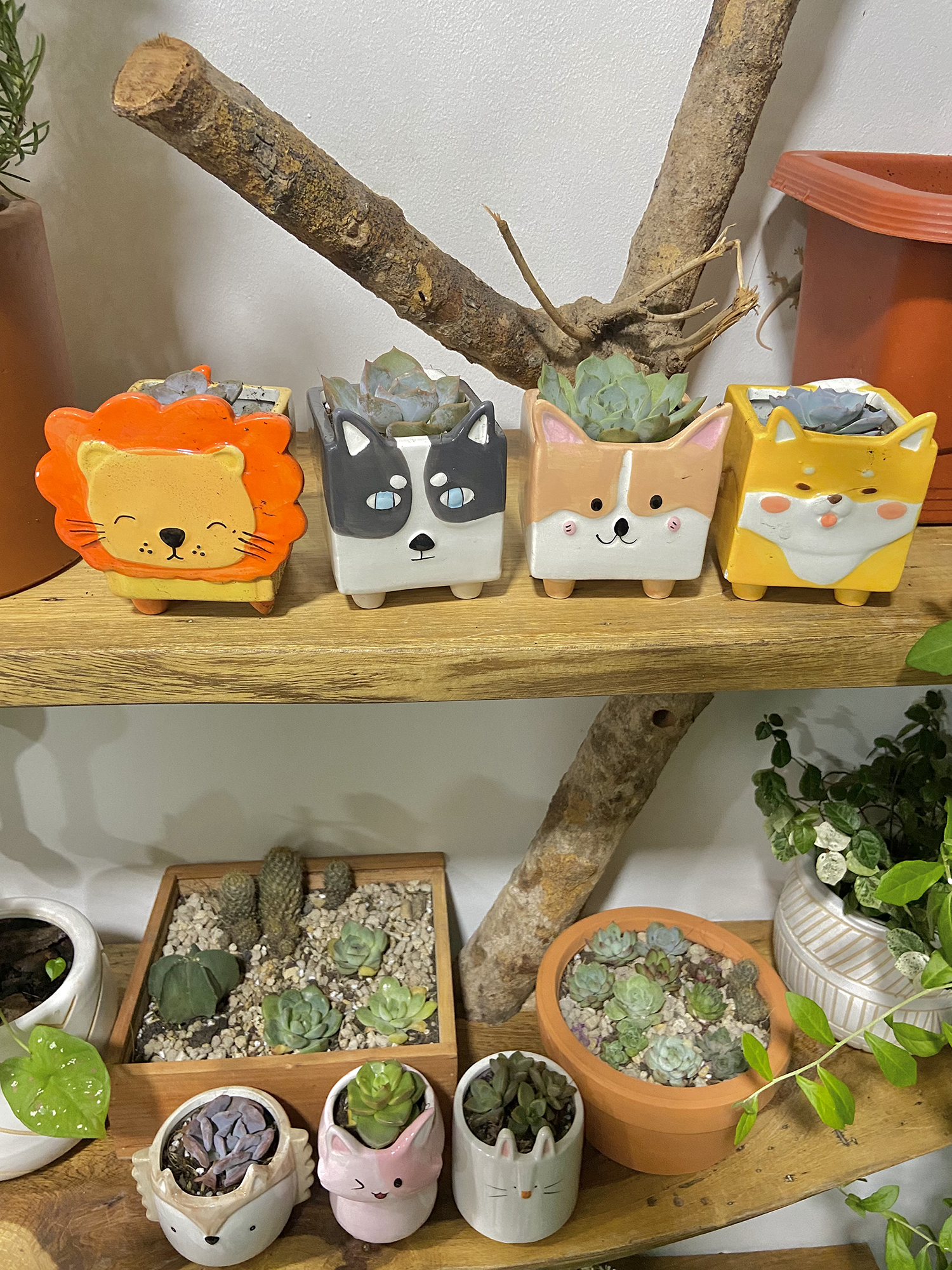 Để tạo thêm điểm nhấn cho kệ cây, Dung tìm mua thêm các chậu trồng với hình dáng và họa tiết độc đáo. Đan xen là những chậu đất nung màu nâu đỏ - đơn giản nhưng vẫn tôn lên màu xanh mát của cây.