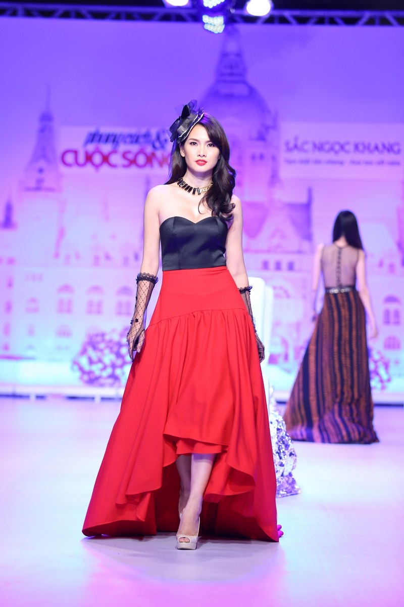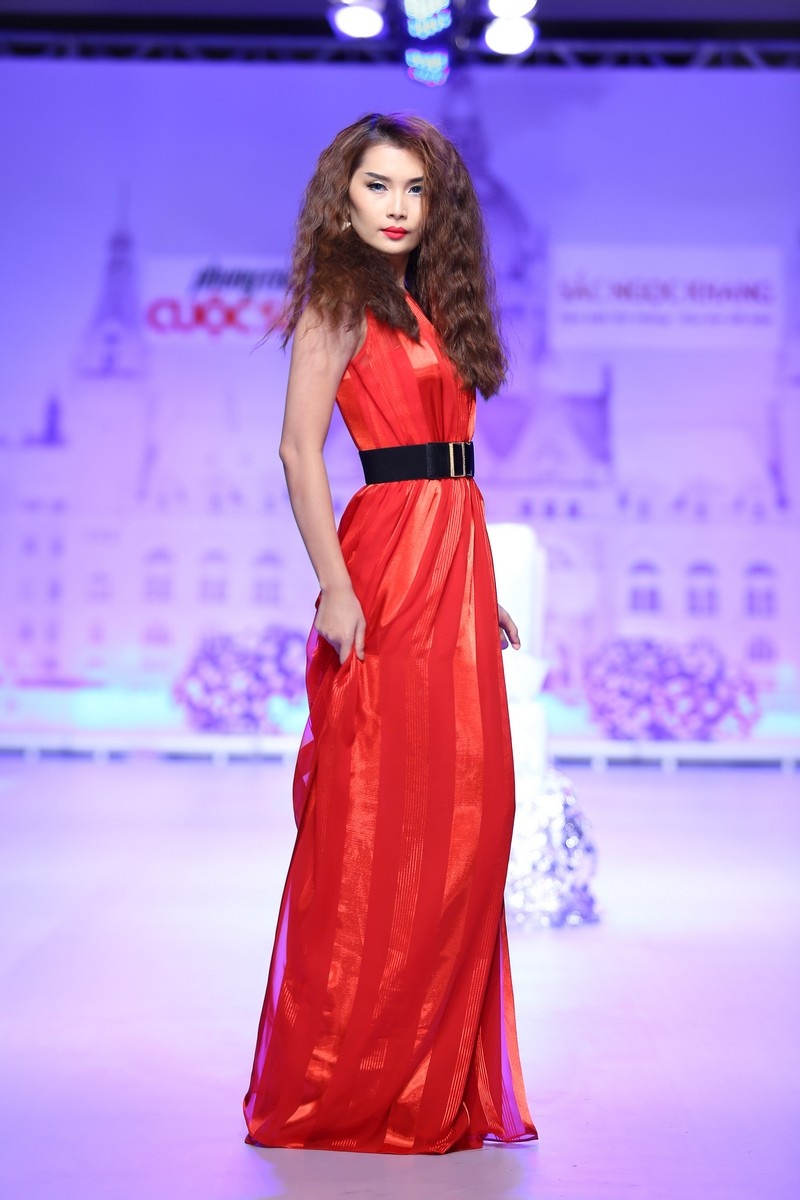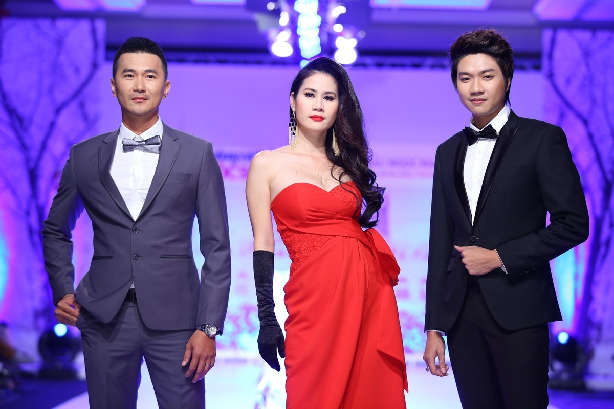 Sở hữu vóc dáng dong dỏng cao và làn da trắng nõn nà, Thân Thúy Hà nổi bật trên sàn diễn với thiết kế dạ hội tông màu đỏ. Tháp tùng người đẹp là nam người mẫu trẻ và diễn viên Quốc Cường.