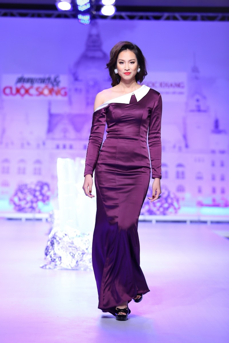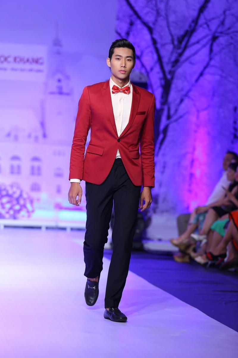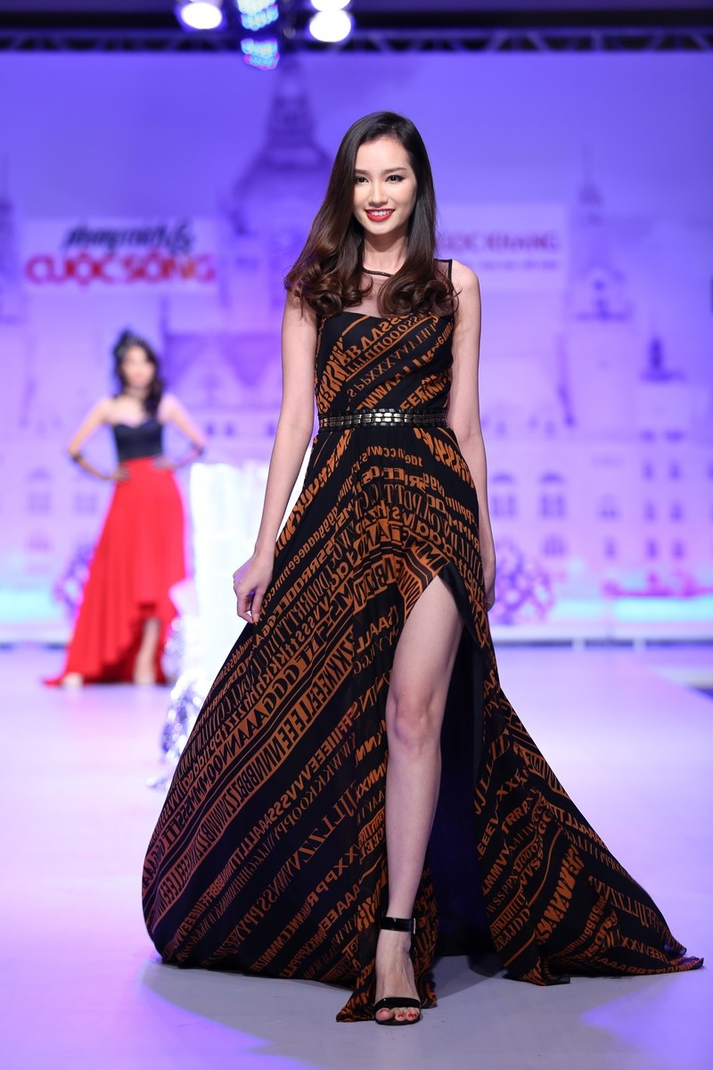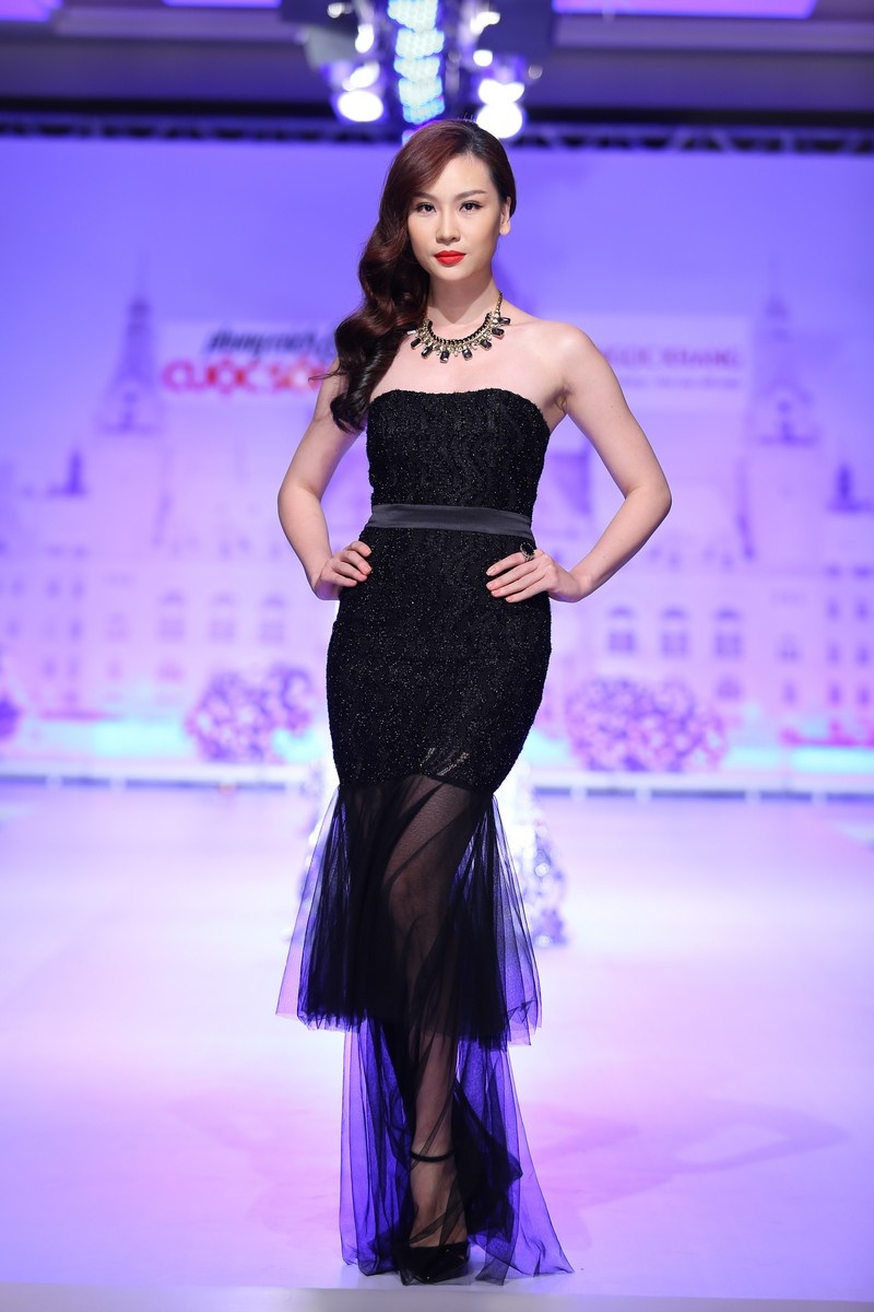 Sở hữu vóc dáng dong dỏng cao và làn da trắng nõn nà, Thân Thúy Hà nổi bật trên sàn diễn với thiết kế dạ hội tông màu đỏ. Tháp tùng người đẹp là nam người mẫu trẻ và diễn viên Quốc Cường.