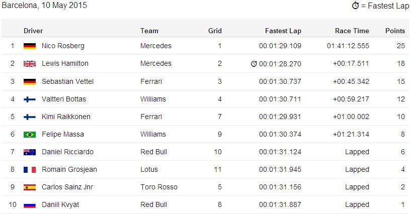 | 10 tay đua giành điểm tại chặng Spanish GP 2015. |