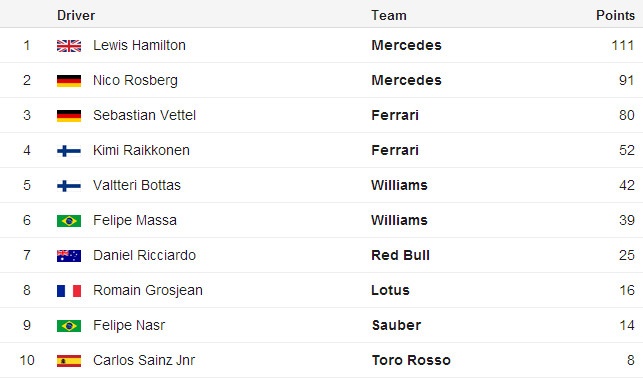 | Chiến thắng tại CIrcuit de Catalunya giúp Rosberg thu hẹp khoảng cách trên bảng xếp hạng tổng với đồng đội Lewis Hamilton xuống còn 20 điểm. |