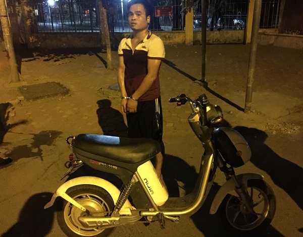 | Nguyên và chiếc xe đạp điện tang vật. Ảnh: H.L. |