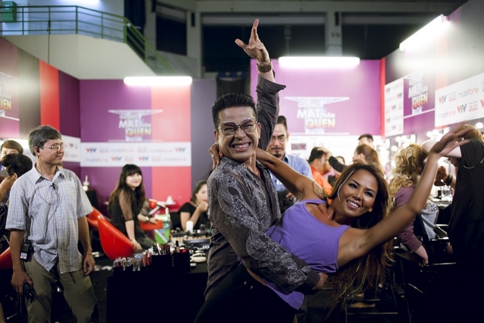 | Cô và Minh Thuận tranh thủ thời gian tập luyện các động tác vũ đạo trước khi ra sân khấu. |