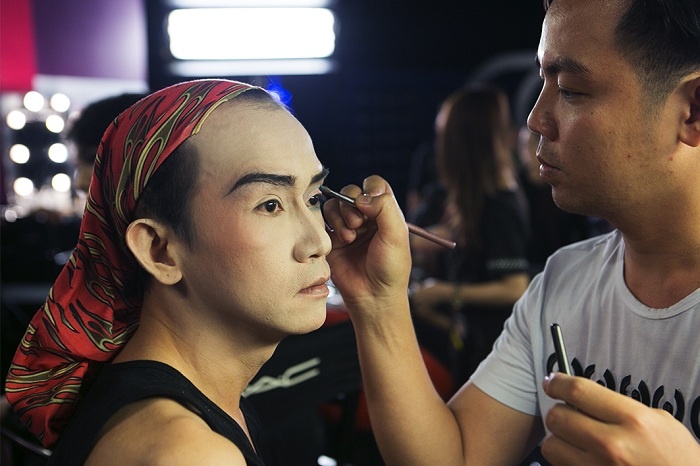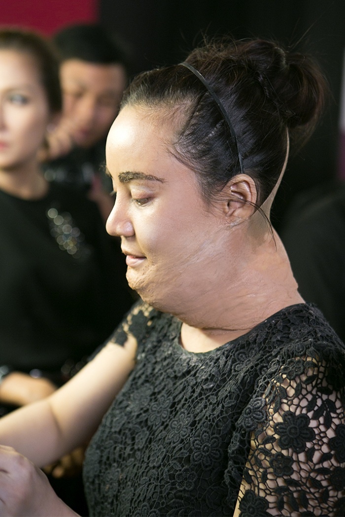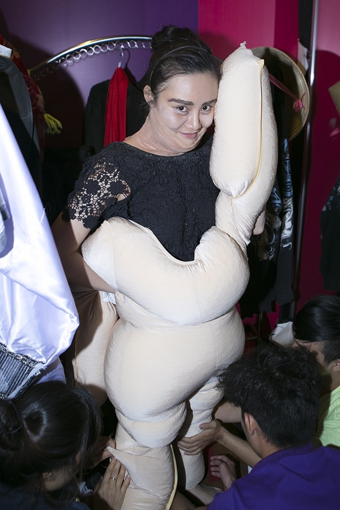 Để hoá thân giống Susan Boyle, Vy Oanh phải độn cầm và mặc một loại trang phục đặc biệt để có thân hình mập mạp giống nhân vật. |