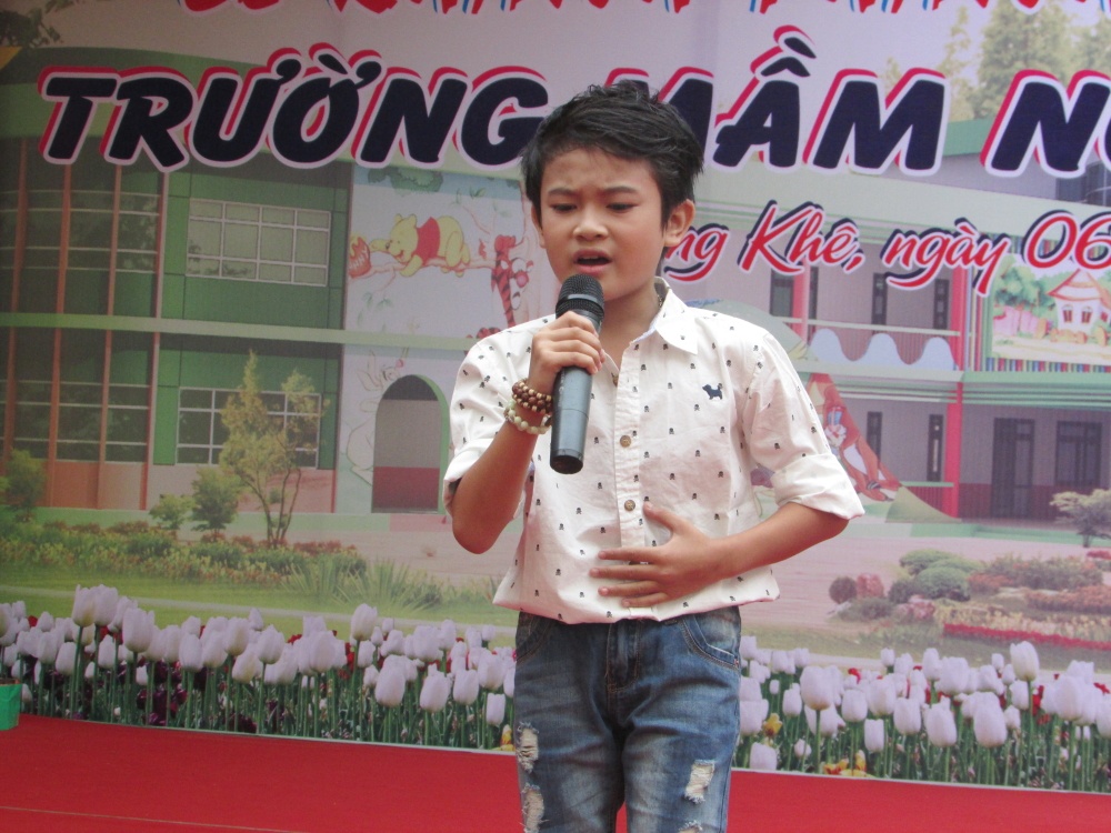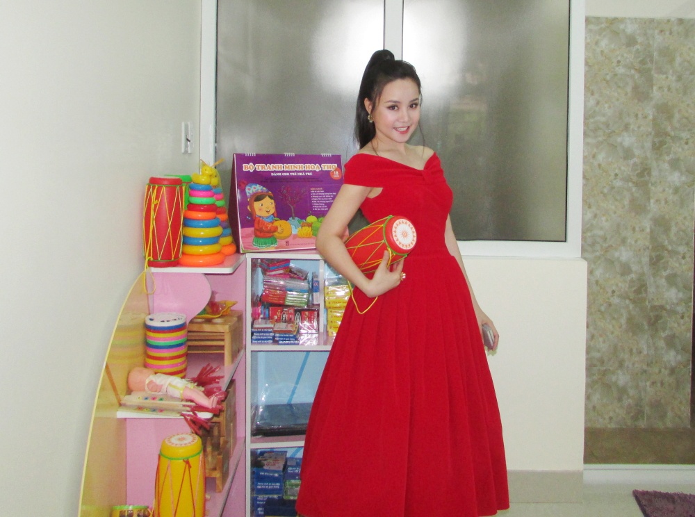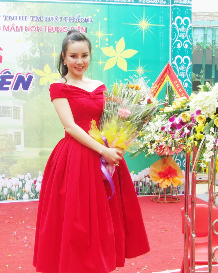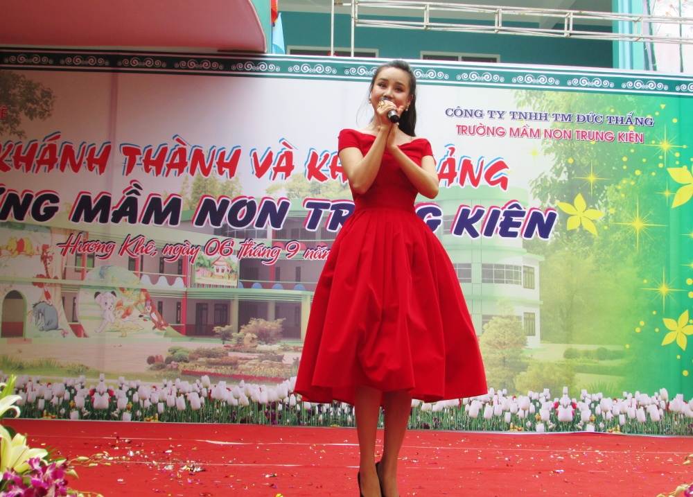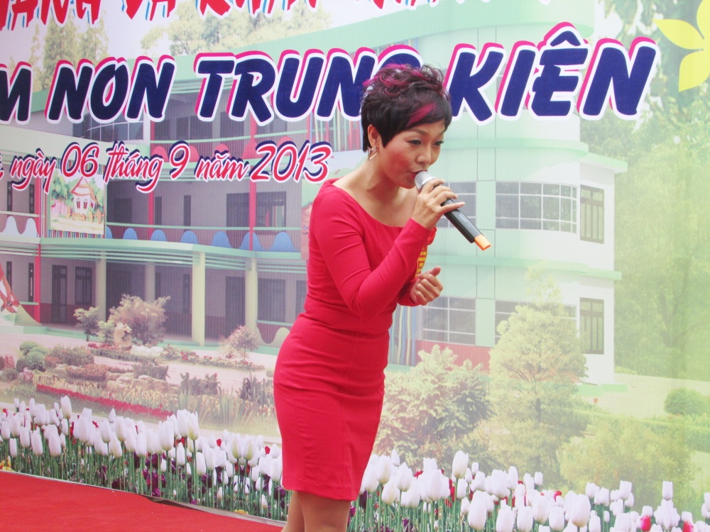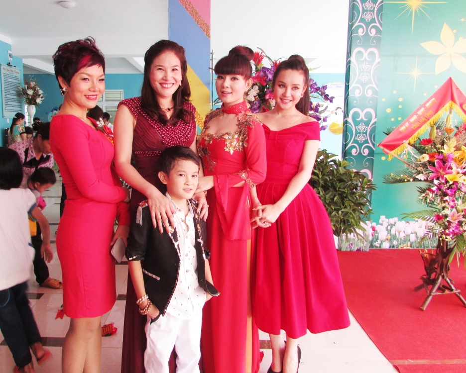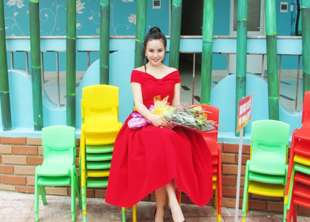 Sao Mai Bùi Lê Mận cũng góp mặt trong chương trình này. Không hề hẹn trước, nhưng cả ba giọng ca xinh đẹp đều chọn đồ màu đỏ nổi bật và rực rỡ, rất phù hợp với lễ khánh thành và khai giảng của trường mầm non.