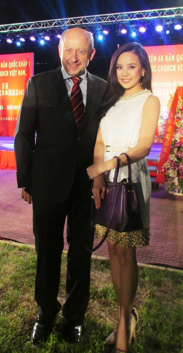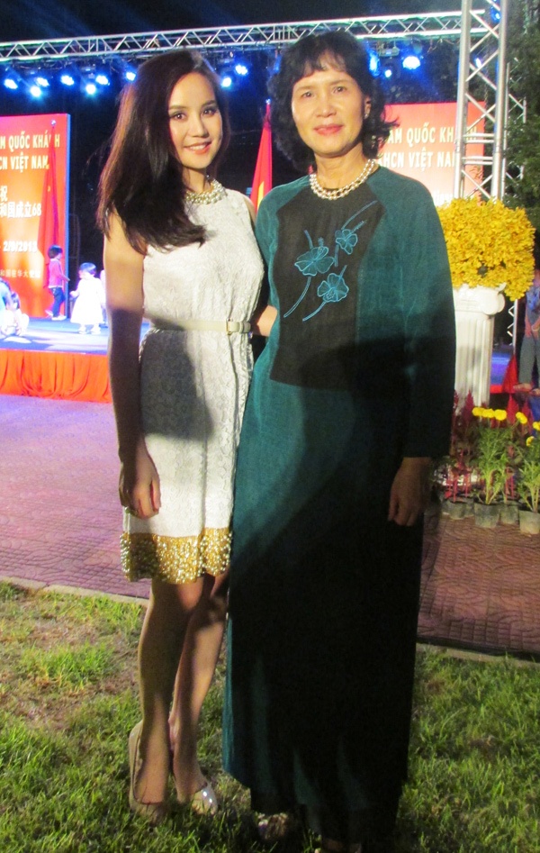 | Sau buổi biểu diễn được mọi người ngợi khen thành công, Vy Oanh có buổi tiệc buffet cùng ở Đại sứ quán. Cô chụp cùng phu nhân Tạ Anh Đào. |