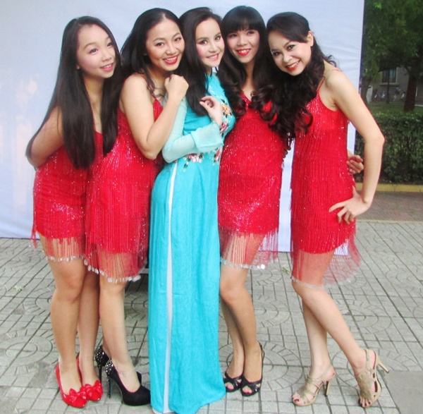 Nữ ca sĩ chụp hình với nhóm Mặt trời đỏ.