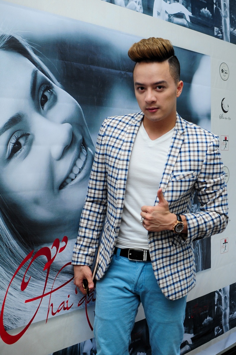 Đến buổi họp báo của Uyên Trang còn có ca sĩ Cao Thái Sơn. Anh tranh thủ ghé qua chúc mừng đàn chị rồi lại chạy đi công việc.