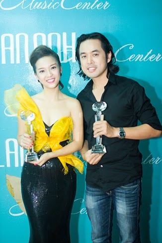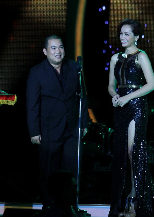 | Nhạc sĩ Huy Tuấn và hoa hậu Diễm Hương cùng đứng trên bục trao giải. |