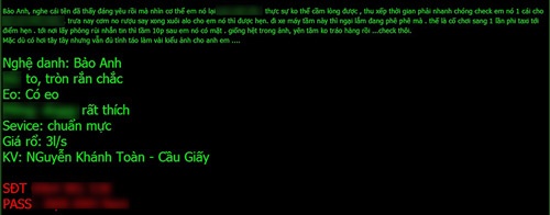 Tiếp đến là các dữ liệu, thông số kỹ thuật (Tên: Linh (tên giả), SĐT: 0936..., pass: bạn anh Tuấn, giá: 400k, KV: Cầu Giấy, Mặt: xinh, đáng yêu, Body: ngon, nước da: trắng mịn nước hoa thơm lừng, Vòng 2: 10 điểm không mỡ bụng, Thái độ phục vụ: ngoan ngoãn dễ bảo, ...).