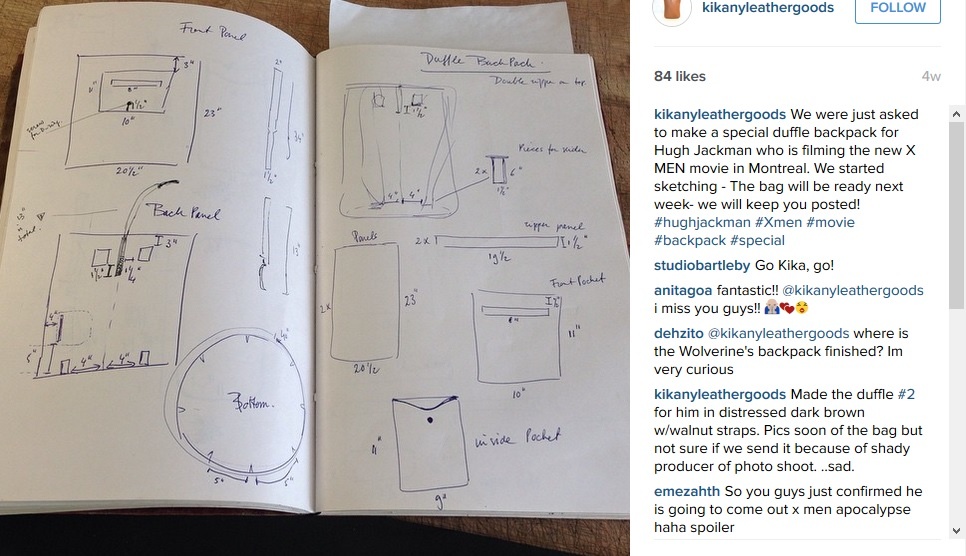 Nhưng người hâm mộ rốt cuộc cũng có được lời giải đáp cho câu hỏi liệu Hugh Jackman có tham gia tập tiếp theo của series X-Men hay không? Trang Heroic Hollywood đăng tải bức hình được đăng trên mạng xã hội Instagram của một công ty làm đồ da tại New York. Theo đó, họ đang thiết kế một chiếc túi da đặc biệt dành cho Wolverine trong X-Men: Apocalypse.