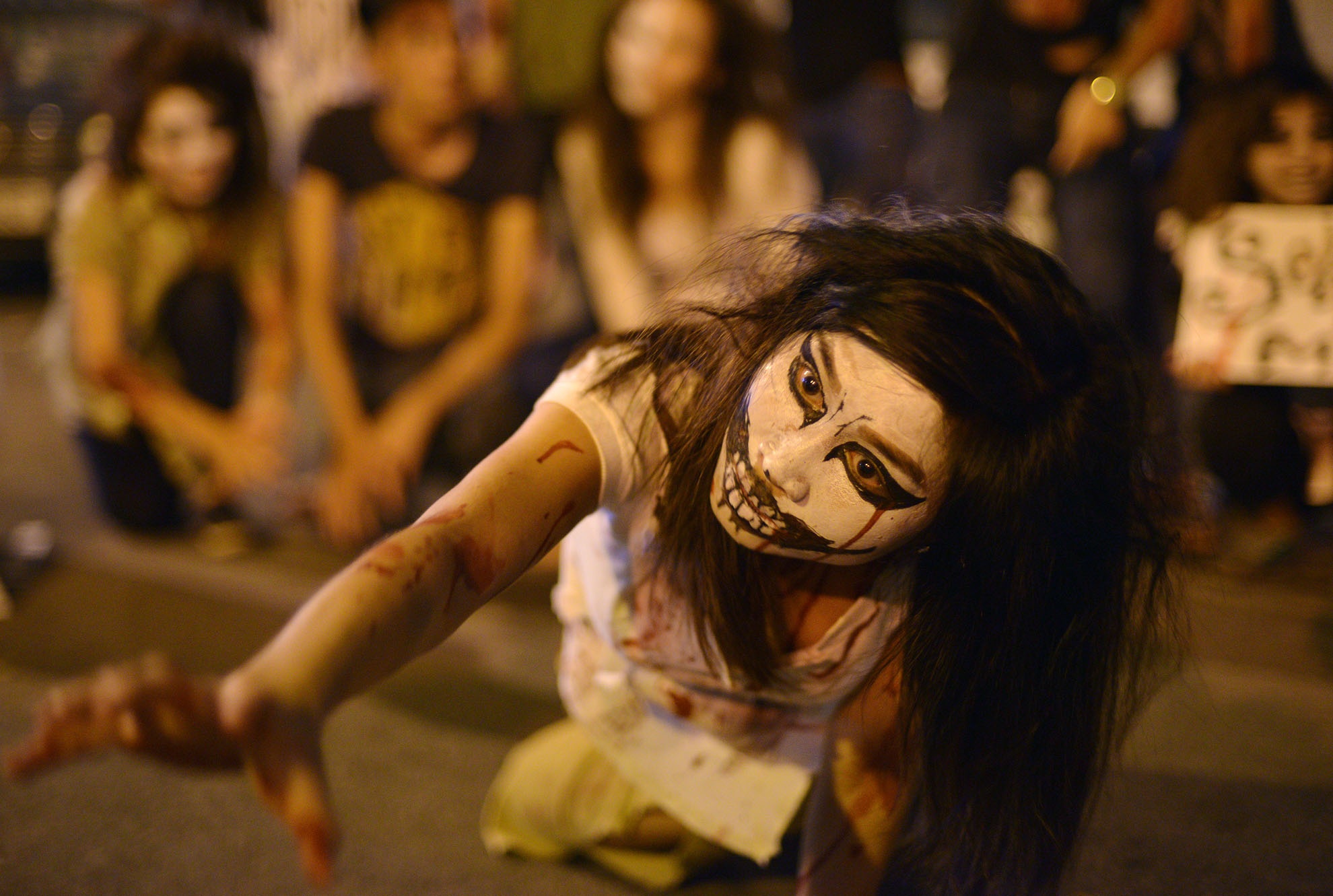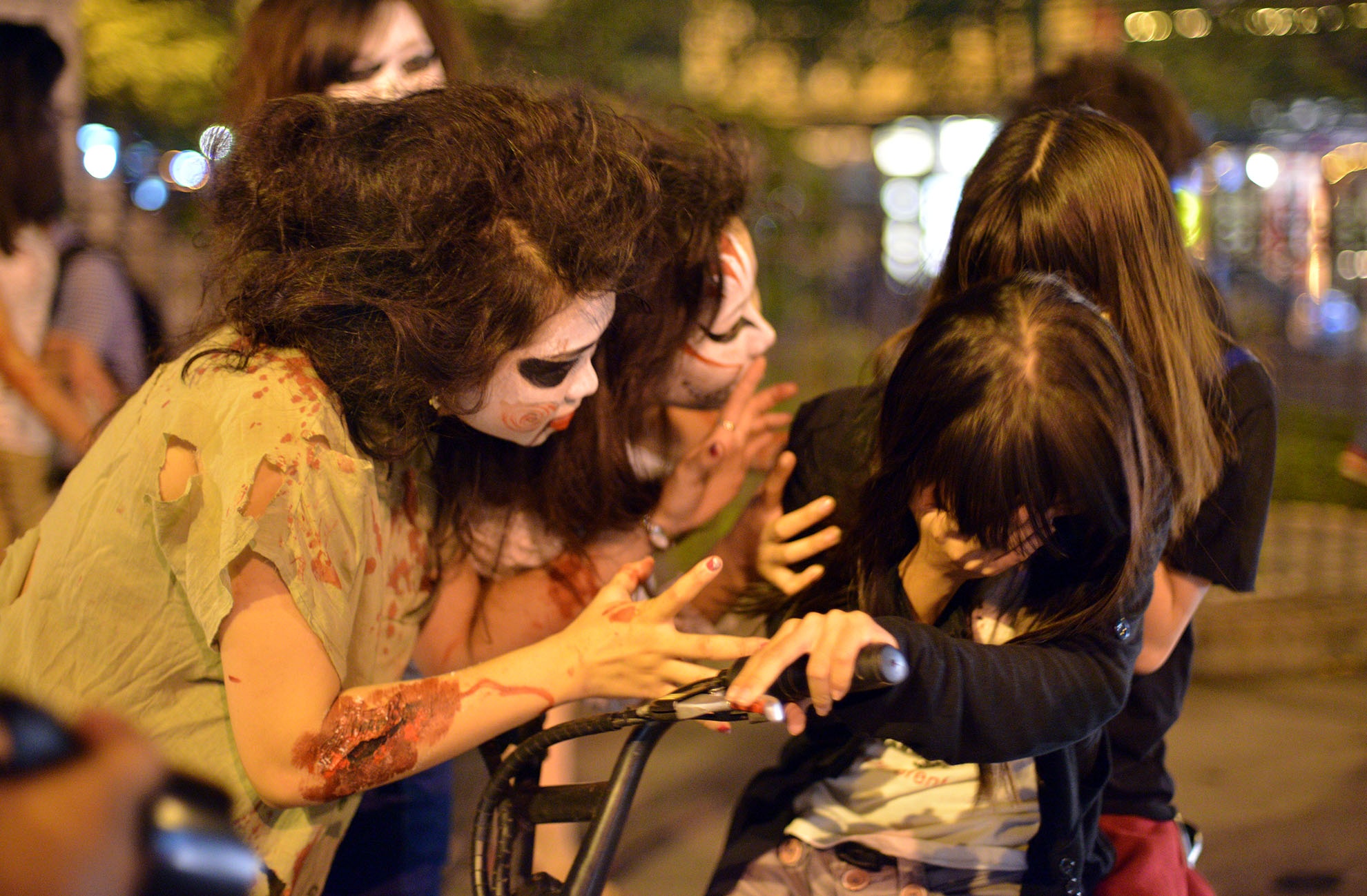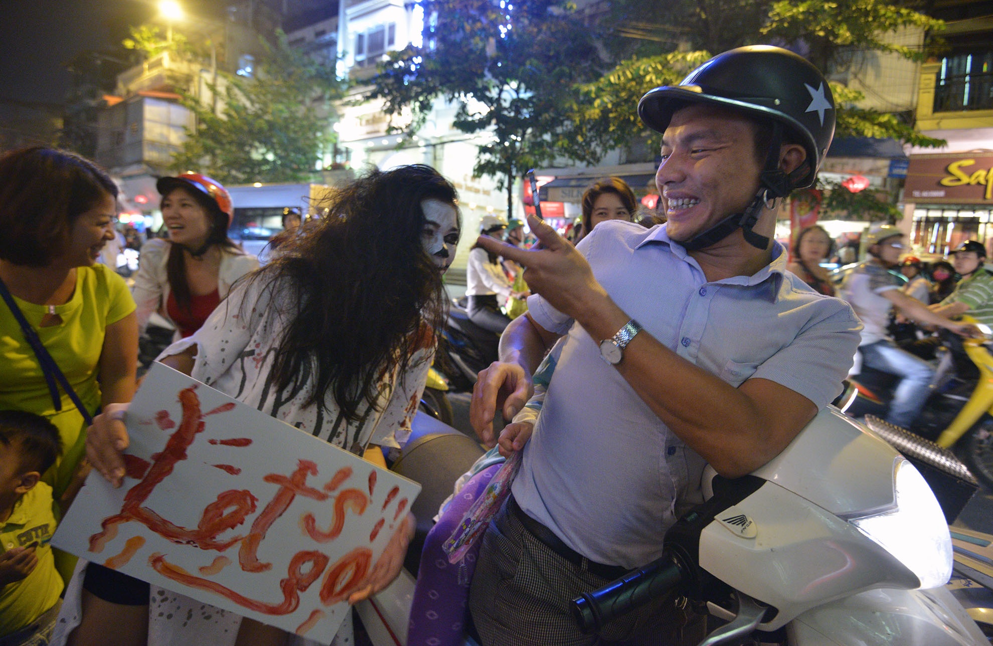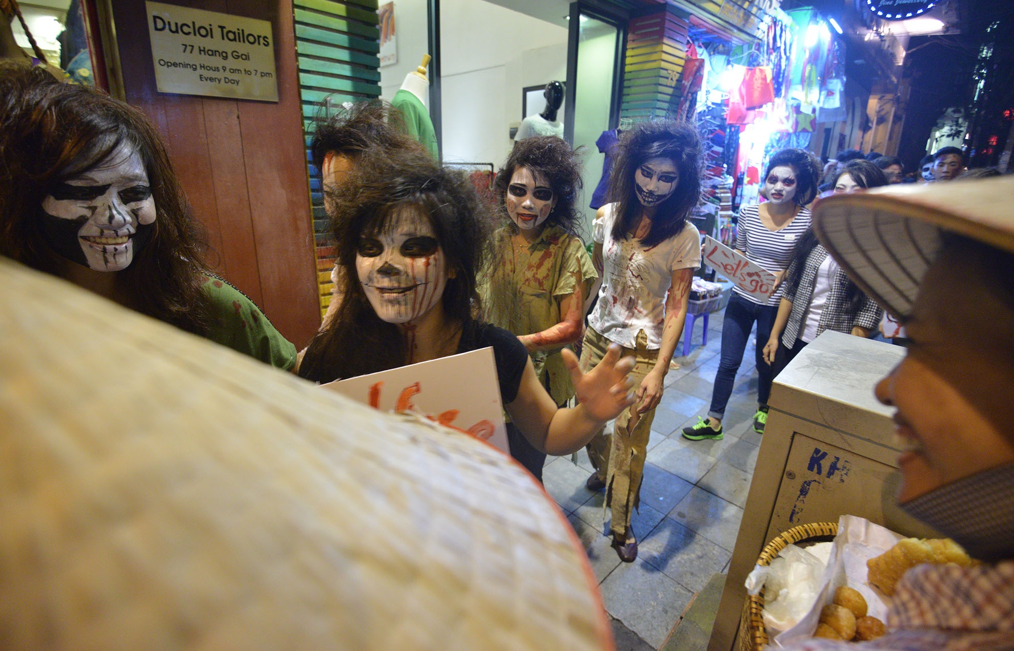 Lượn lờ, đi dạo trên phố, ập đến dọa dẫm từ phía sau, lao ra hù tài xế taxi... là hình ảnh một nhóm bạn trẻ ở Hà Nội hóa trang thành xác sống khuấy động phong trào Halloween.