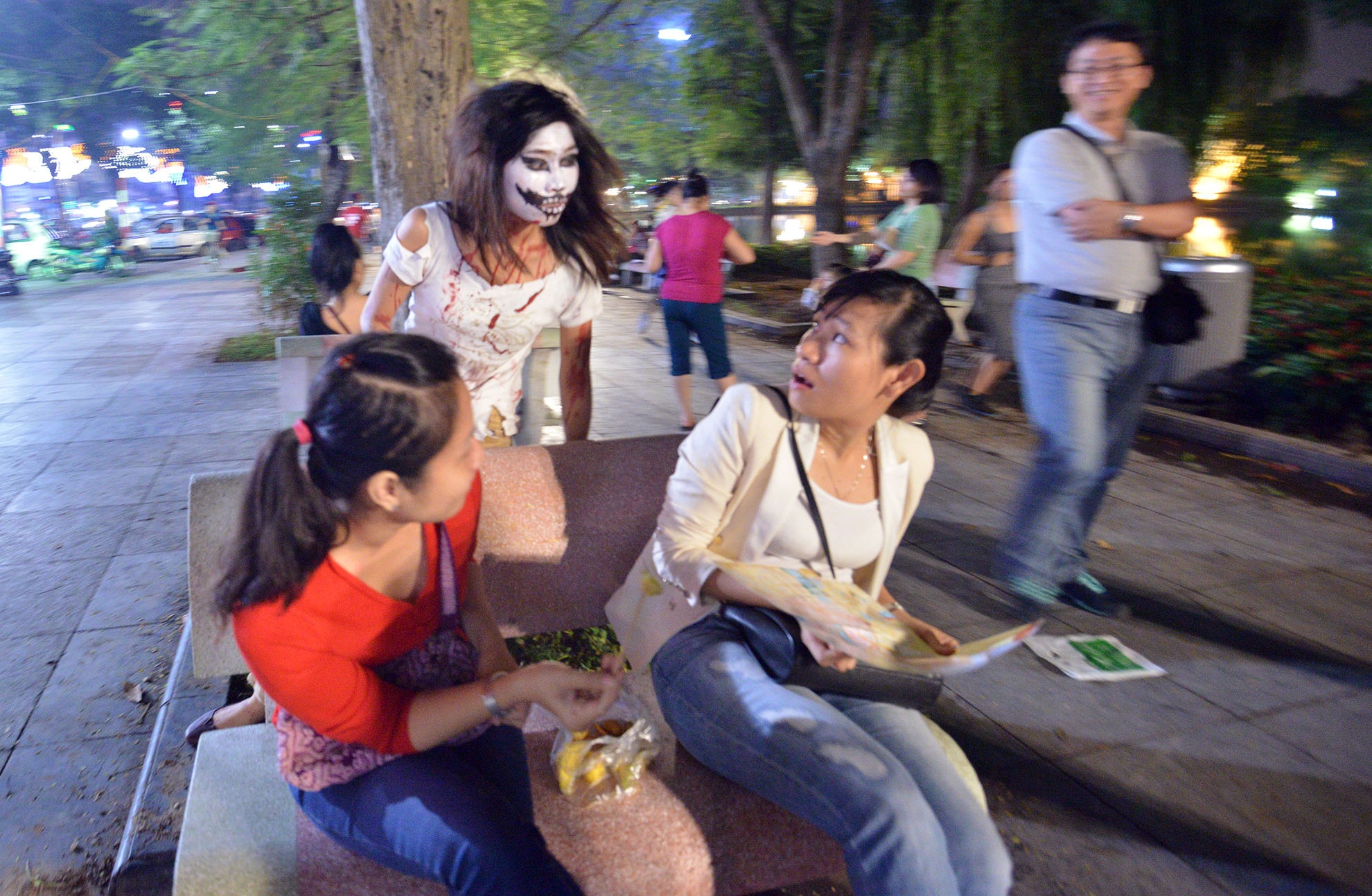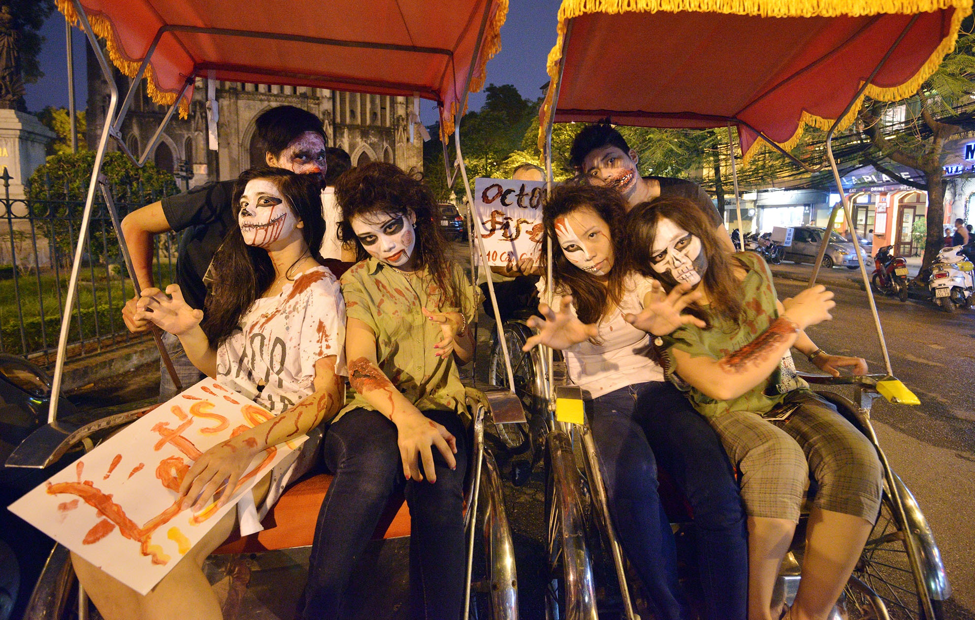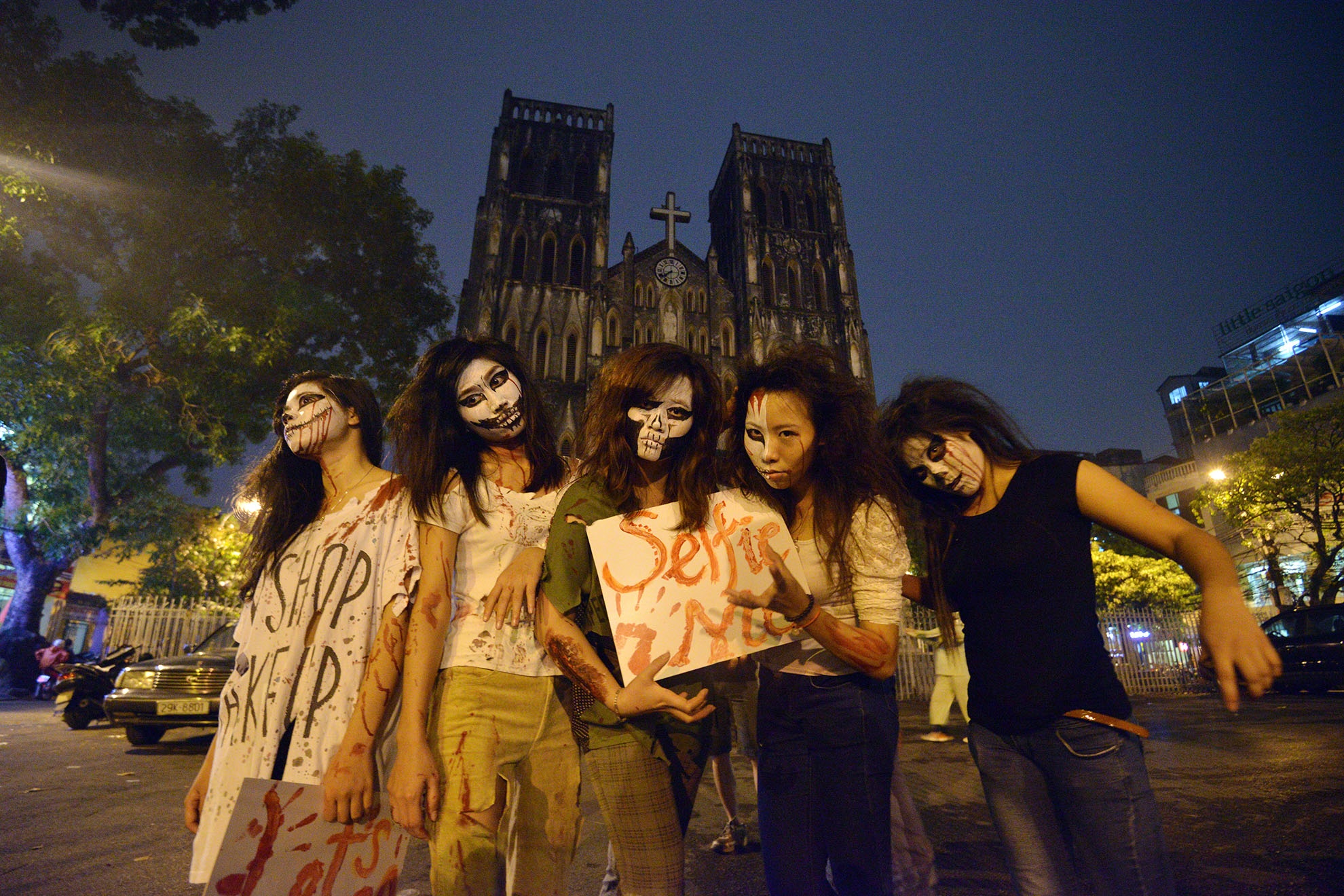 | Chuẩn bị cho ngày hội Halloween sắp tới, tối 17/10 một nhóm bạn trẻ hơn 10 người của CLB Zombie Walk đã hóa trang thành xác sống (Zombie) đi dọc các tuyến phố Hàng Trống, Bảo Khánh và khu Nhà Thờ Lớn (quận Hoàn Kiếm) để khuấy động phong trào. |