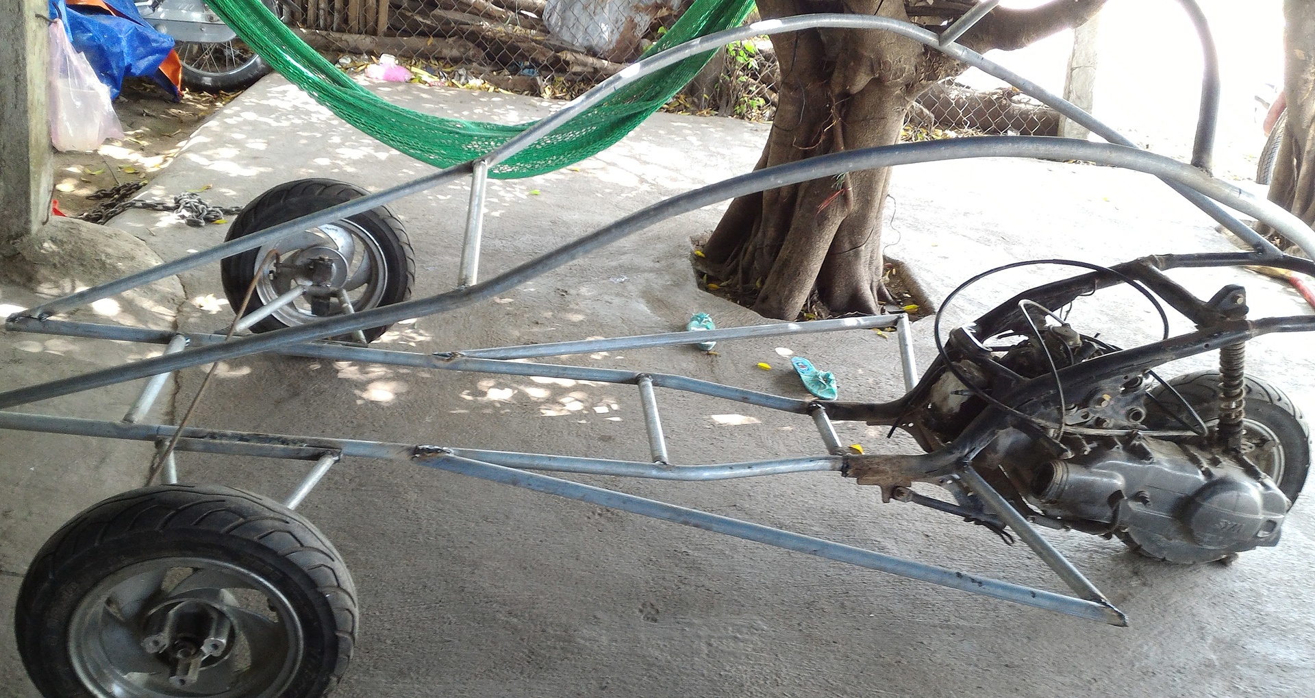 | Kết cấu khung sườn bên trong được hàn nối từ ống thép. Để có động cơ sử dụng cho xe tự chế, anh Quý mua lại chiếc Attila cũ với giá 5 triệu. Đồng thời, 2 bánh xe cũng được tận dụng. |