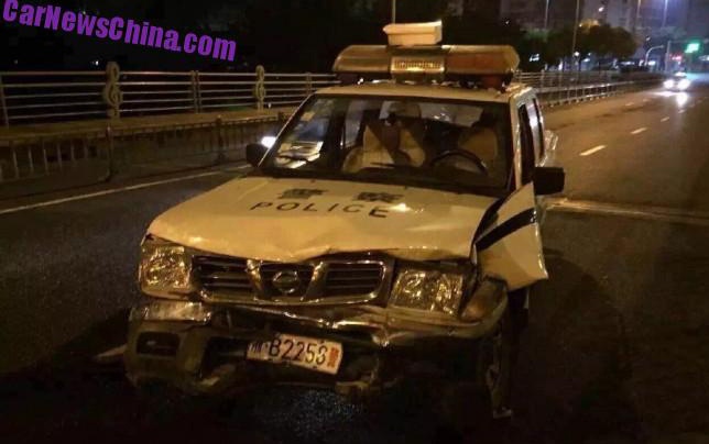 | Xe cảnh sát bị hư hỏng phần đầu. Ảnh: Carnewschina. |