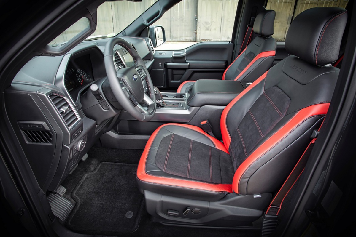 | Nội thất trên F-150 đặc biệt cũng rất khác biệt, ghế ngồi bọc da Alcantara, đi cùng đường chỉ thêu màu đỏ tương phản. Vô-lăng cũng mang màu đen với đường chỉ thêu đỏ. |