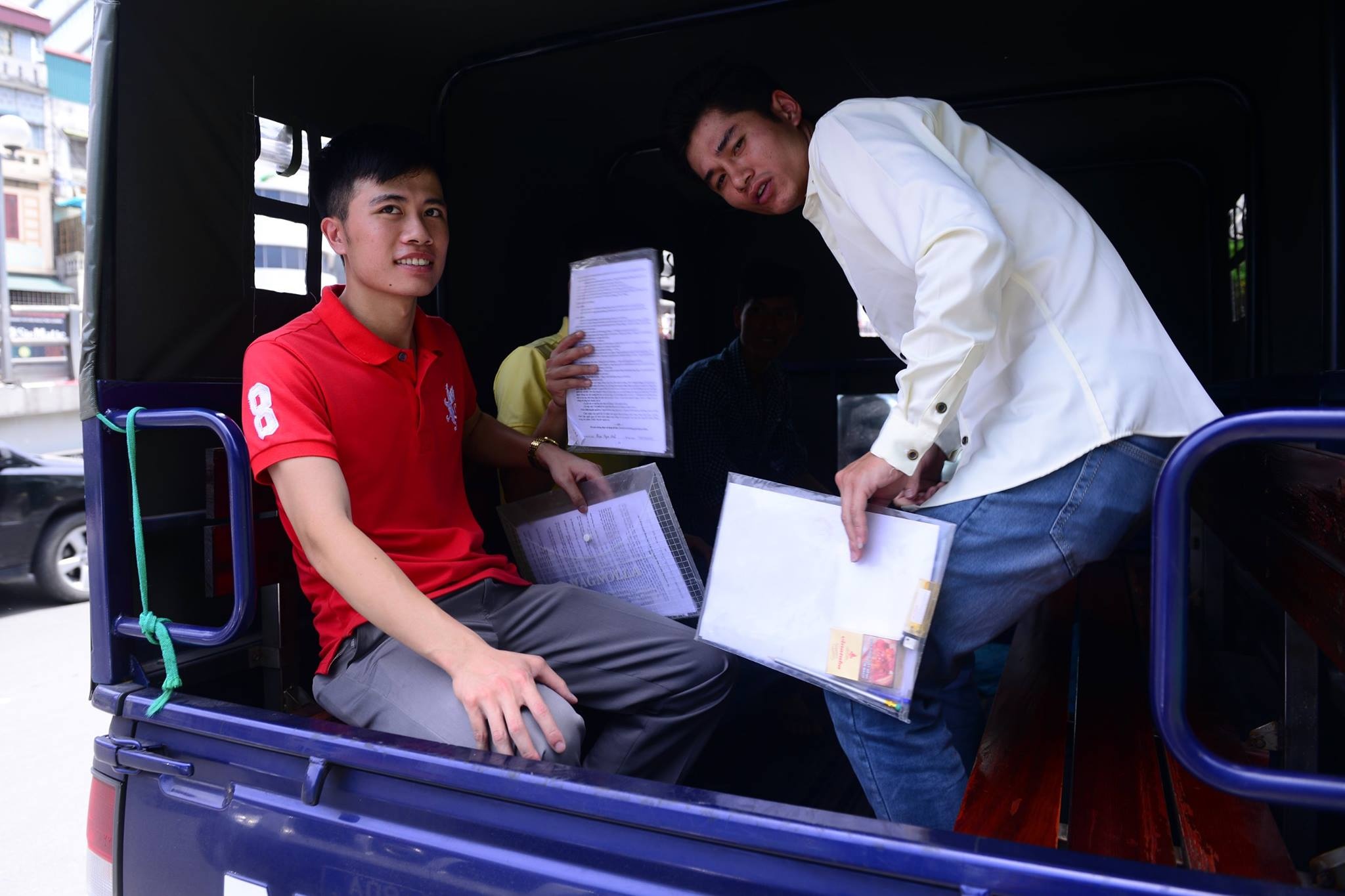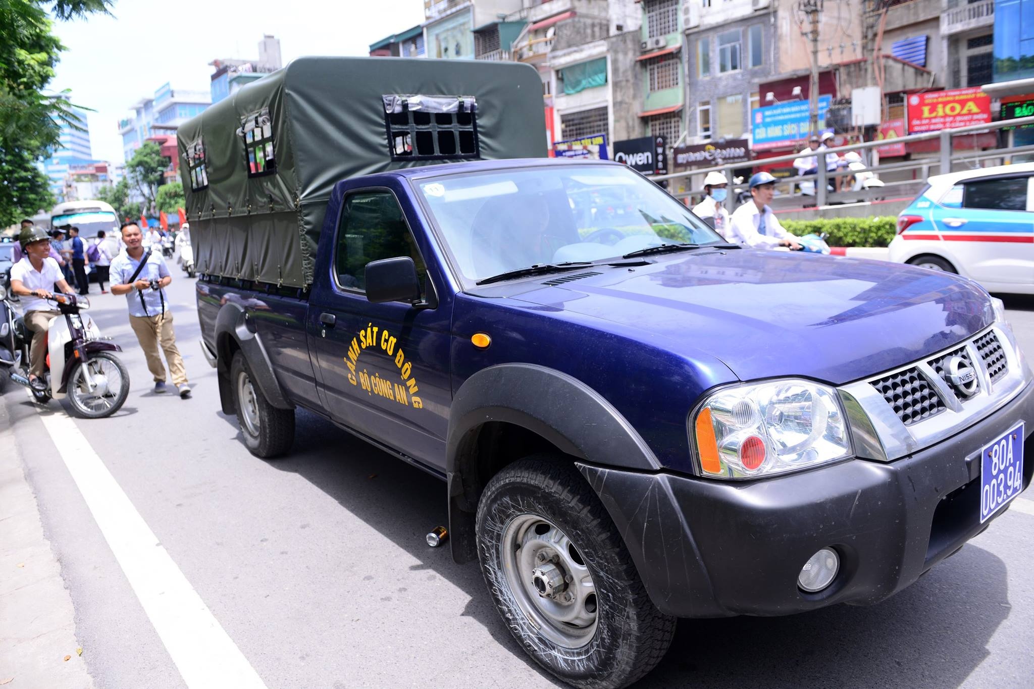 | Một trong hai xe đưa, đón những chiến sĩ đi thi. |