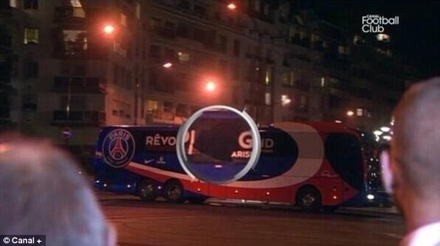 | Kênh truyền hình Canal+ đã đăng tải bức ảnh chiếc xe buýt chở cầu thủ PSG bị tấn công. Chỗ khoanh tròn là chô kính bị vỡ. |