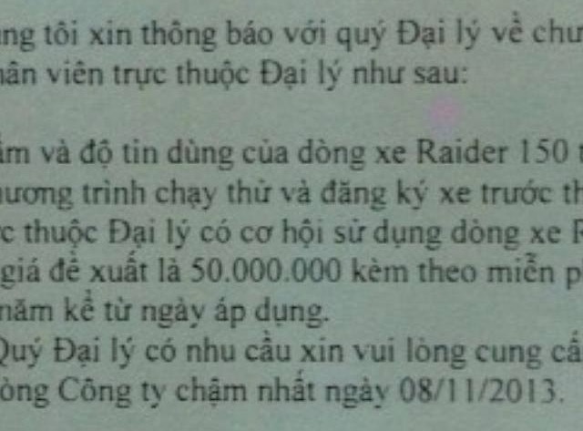 Bức hình được đăng tải trên một fanpage mới đây hé lộ văn bản của Suzuki Việt Nam gửi các đại lý. Theo đó, văn bản có nội dung dành một số ưu đãi cho các đại lý, đồng thời giá bán cho Suzuki Raider 150 cũng được đề xuất là 50 triệu đồng.