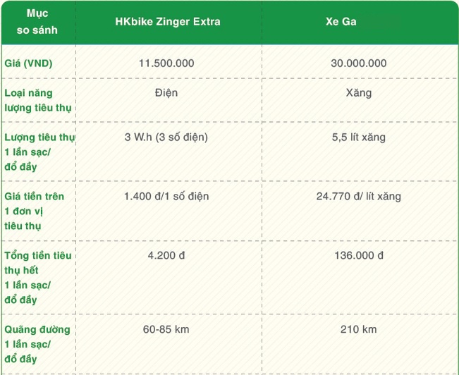 Dòng xe đạp điện HKbike Zinger Extra đang là một “hiện tượng” đối với người tiêu dùng khi quãng đường chiếc xe này mang lại lên tới 70-85km sau một lần sạc đầy, một điều chưa từng có đối với dòng sản phẩm xe đạp điện trên thị trường. Thậm chí, nếu so sánh với các loại xe máy số tiết kiệm nhất hiện nay, Hãng có rất nhiều ưu điểm đáng để người dùng phải xem xét. Dưới đây là bảng so sánh xe đạp điện của hãng với loại xe ga được cho là rẻ nhất hiện nay tại Việt Nam: