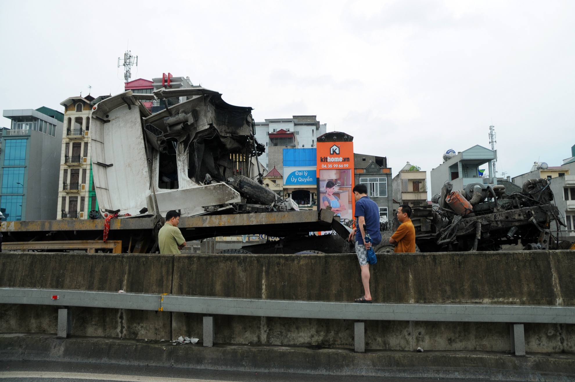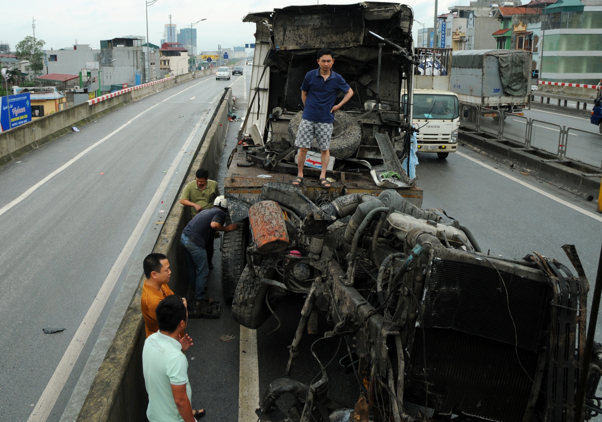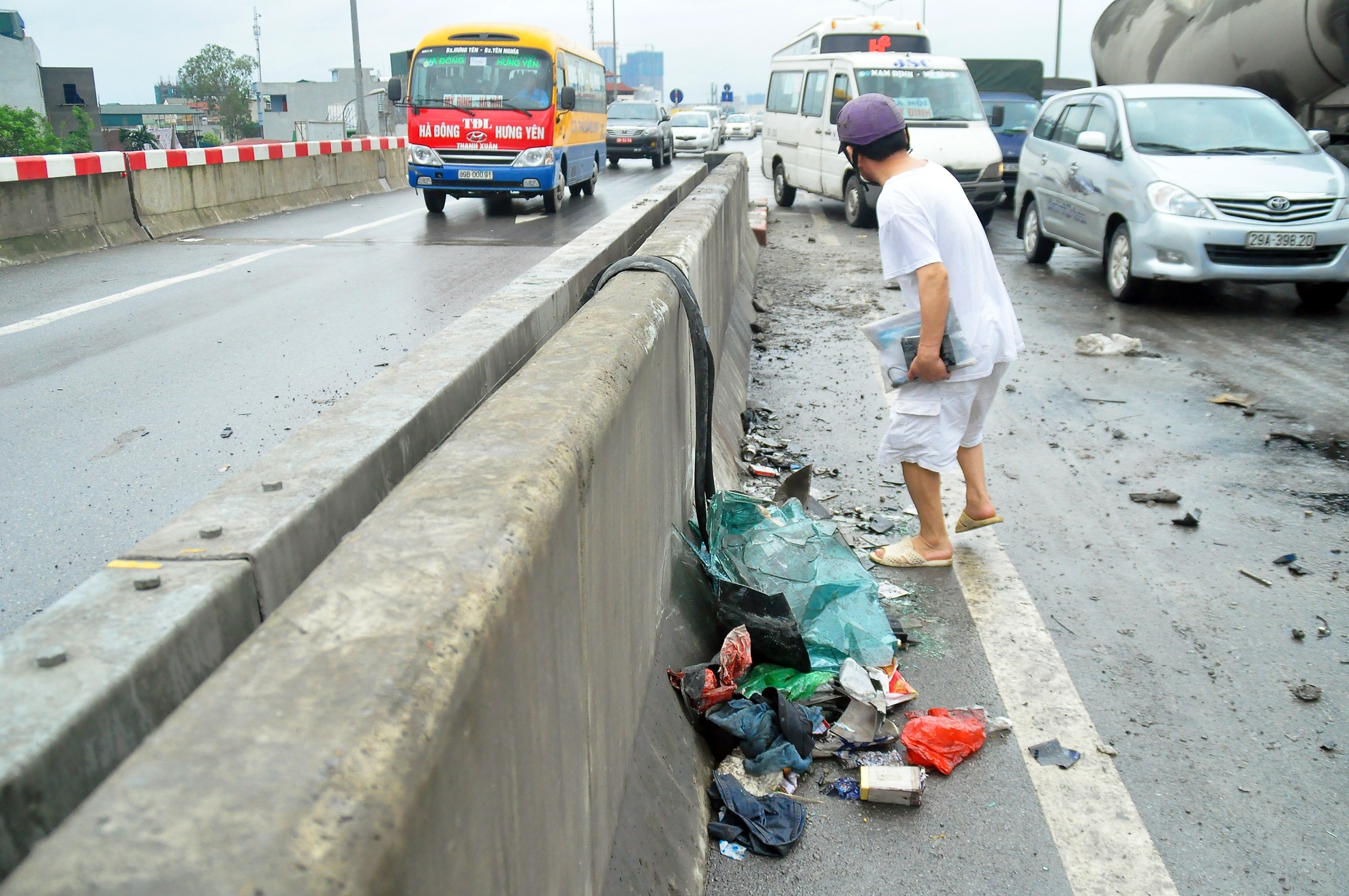 Dải phân cách giữa đường xuống Nguyễn Xiển - Nguyễn Trãi và hướng Linh Đàm - cầu Thăng Long bị hư hại. Kính lái bị vỡ vụn, các phụ tùng rơi vãi trên đường cao tốc khiến các phương tiện khác phải di chuyển chậm lại.